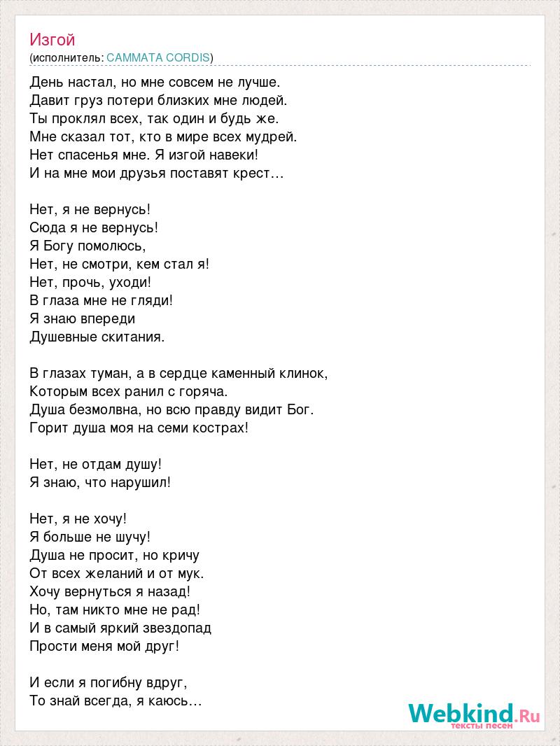 День настал, но мне совсем не лучше. Давит груз потери близких мне людей. Ты проклял всех, так один и будь же. Мне сказал тот, кто в мире всех мудрей. Нет спасенья мне. Я изгой навеки! И на мне мои друзья поставят крест… Нет, я не вернусь! Сюда я не вернусь! Я Богу помолюсь, Нет, не смотри, кем стал я! Нет, прочь, уходи! В глаза мне не гляди! Я знаю впереди Душевные скитания. В глазах туман, а в сердце каменный клинок, Которым всех ранил с горяча. Душа безмолвна, но всю правду видит Бог. Горит душа моя на семи кострах! Нет, не отдам душу! Я знаю, что нарушил! Нет, я не хочу! Я больше не шучу! Душа не просит, но кричу От всех желаний и от мук. Хочу вернуться я назад! Но, там никто мне не рад! И в самый яркий звездопад Прости меня мой друг! И если я погибну вдруг, То знай всегда, я каюсь…