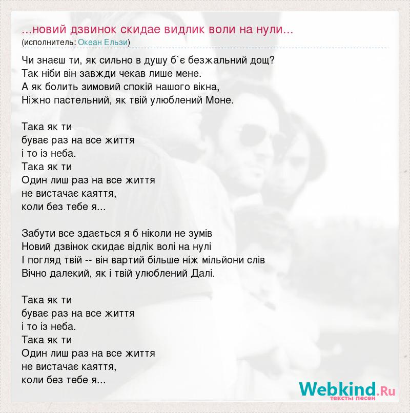 Чи знаєш ти, як сильно в душу б`є безжальний дощ? Так ніби він завжди чекав лише мене. А як болить зимовий спокій нашого вікна, Ніжно пастельний, як твій улюблений Моне. Така як ти буває раз на все життя і то із неба. Така як ти Один лиш раз на все життя не вистачає каяття, коли без тебе я... Забути все здається я б ніколи не зумів Новий дзвінок скидає відлік волі на нулі І погляд твій -- він вартий більше ніж мільйони слів Вічно далекий, як і твій улюблений Далі. Така як ти буває раз на все життя і то із неба. Така як ти Один лиш раз на все життя не вистачає каяття, коли без тебе я...