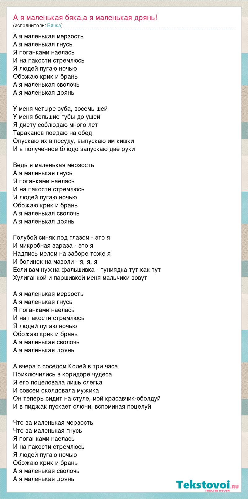 А я маленькая мерзость А я маленькая гнусь Я поганками наелась И на пакости стремлюсь Я людей пугаю ночью Обожаю крик и брань А я маленькая сволочь А я маленькая дрянь У меня четыре зуба, восемь шей У меня большие губы до ушей Я диету соблюдаю много лет Тараканов поедаю на обед Опускаю их в посуду, выпускаю им кишки И в полученное блюдо запускаю две руки Ведь я маленькая мерзость А я маленькая гнусь Я поганками наелась И на пакости стремлюсь Я людей пугаю ночью Обожаю крик и брань А я маленькая сволочь А я маленькая дрянь Голубой синяк под глазом - это я И микробная зараза - это я Надпись мелом на заборе тоже я И ботинок на мазоли - я, я, я Если вам нужна фальшивка - туниядка тут как тут Хулиганкой и паршивкой меня мальчики зовут А я маленькая мерзость А я маленькая гнусь Я поганками наелась И на пакости стремлюсь Я людей пугаю ночью Обожаю крик и брань А я маленькая сволочь А я маленькая дрянь А вчера с соседом Колей в три часа Приключились в коридоре чудеса Я его поцеловала лишь слегка И совсем околдовала мужика Он теперь сидит на стуле, мой красавчик-оболдуй И в пиджак пускает слюни, вспоминая поцелуй Что за маленькая мерзость Что за маленькая гнусь Я поганками наелась И на пакости стремлюсь Я людей пугаю ночью Обожаю крик и брань А я маленькая сволочь А я маленькая дрянь