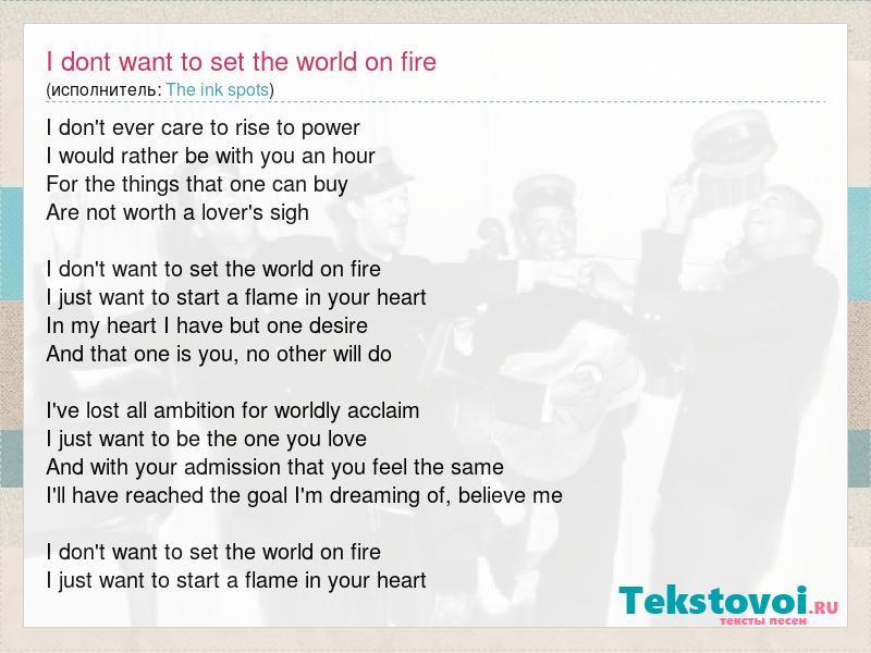 I don't ever care to rise to power I would rather be with you an hour For the things that one can buy Are not worth a lover's sigh I don't want to set the world on fire I just want to start a flame in your heart In my heart I have but one desire And that one is you, no other will do I've lost all ambition for worldly acclaim I just want to be the one you love And with your admission that you feel the same I'll have reached the goal I'm dreaming of, believe me I don't want to set the world on fire I just want to start a flame in your heart