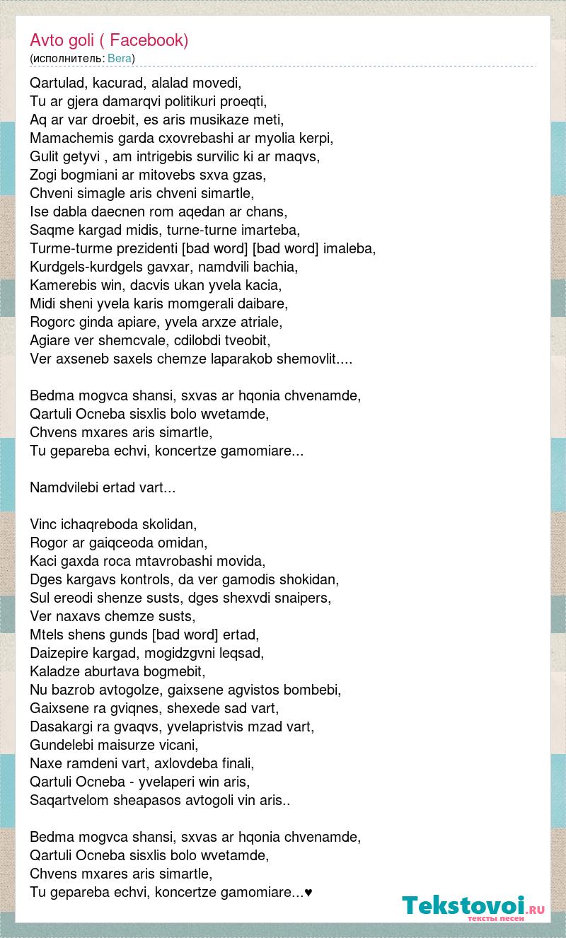 Qartulad, kacurad, alalad movedi, Tu ar gjera damarqvi politikuri proeqti, Aq ar var droebit, es aris musikaze meti, Mamachemis garda cxovrebashi ar myolia kerpi, Gulit getyvi , am intrigebis survilic ki ar maqvs, Zogi bogmiani ar mitovebs sxva gzas, Chveni simagle aris chveni simartle, Ise dabla daecnen rom aqedan ar chans, Saqme kargad midis, turne-turne imarteba, Turme-turme prezidenti [bad word] grubel imaleba, Kurdgels-kurdgels gavxar, namdvili bachia, Kamerebis win, dacvis ukan yvela kacia, Midi sheni yvela karis momgerali daibare, Rogorc ginda apiare, yvela arxze atriale, Agiare ver shemcvale, cdilobdi tveobit, Ver axseneb saxels chemze laparakob shemovlit.... Bedma mogvca shansi, sxvas ar hqonia chvenamde, Qartuli Ocneba sisxlis bolo wvetamde, Chvens mxares aris simartle, Tu gepareba echvi, koncertze gamomiare... Namdvilebi ertad vart... Vinc ichaqreboda skolidan, Rogor ar gaiqceoda omidan, Kaci gaxda roca mtavrobashi movida, Dges kargavs kontrols, da ver gamodis shokidan, Sul ereodi shenze susts, dges shexvdi snaipers, Ver naxavs chemze susts, Mtels shens gunds [bad word] ertad, Daizepire kargad, mogidzgvni leqsad, Kaladze aburtava bogmebit, Nu bazrob avtogolze, gaixsene agvistos bombebi, Gaixsene ra gviqnes, shexede sad vart, Dasakargi ra gvaqvs, yvelapristvis mzad vart, Gundelebi maisurze vicani, Naxe ramdeni vart, axlovdeba finali, Qartuli Ocneba - yvelaperi win aris, Saqartvelom sheapasos avtogoli vin aris.. Bedma mogvca shansi, sxvas ar hqonia chvenamde, Qartuli Ocneba sisxlis bolo wvetamde, Chvens mxares aris simartle, Tu gepareba echvi, koncertze gamomiare...♥