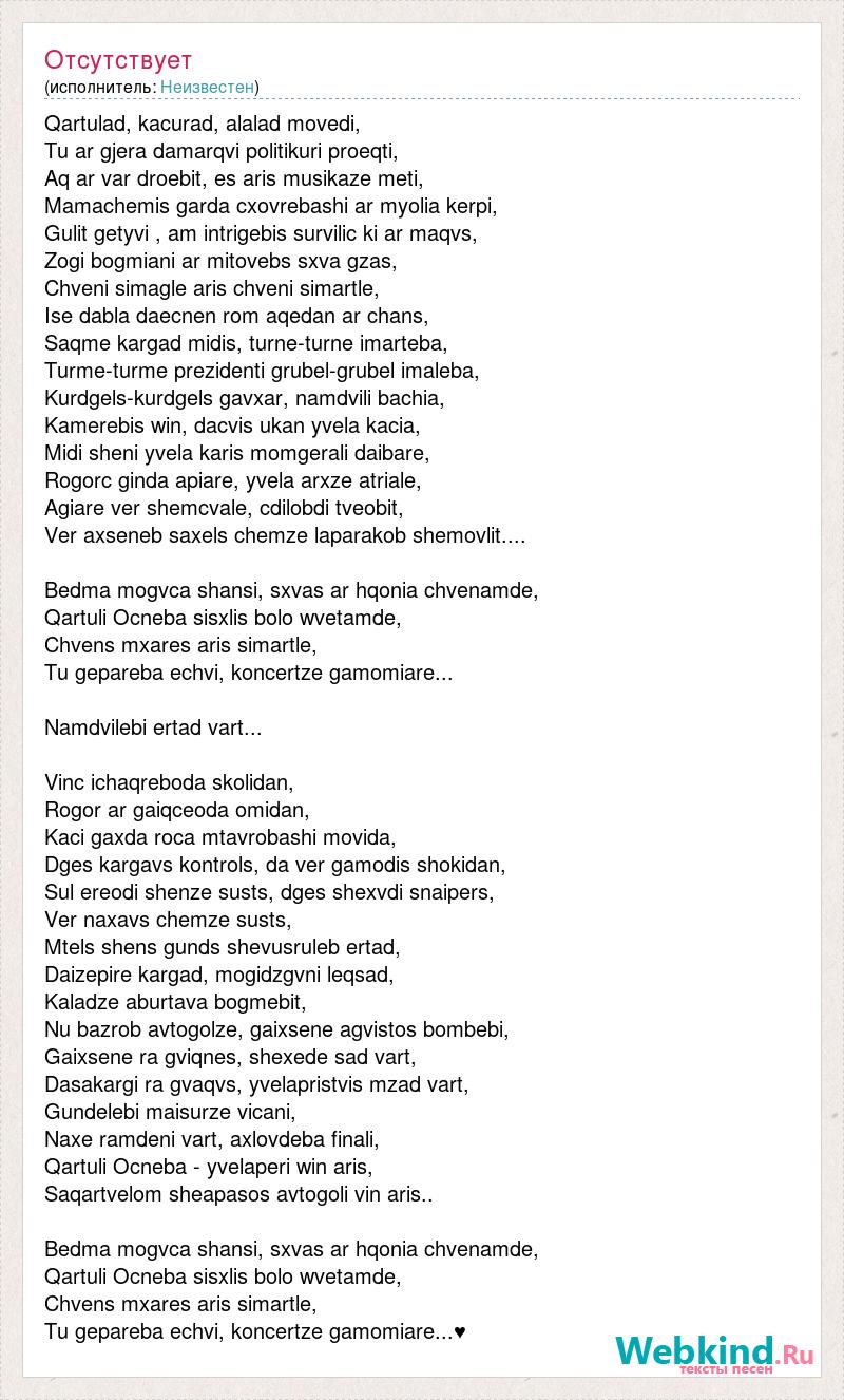Qartulad, kacurad, alalad movedi, Tu ar gjera damarqvi politikuri proeqti, Aq ar var droebit, es aris musikaze meti, Mamachemis garda cxovrebashi ar myolia kerpi, Gulit getyvi , am intrigebis survilic ki ar maqvs, Zogi bogmiani ar mitovebs sxva gzas, Chveni simagle aris chveni simartle, Ise dabla daecnen rom aqedan ar chans, Saqme kargad midis, turne-turne imarteba, Turme-turme prezidenti grubel-grubel imaleba, Kurdgels-kurdgels gavxar, namdvili bachia, Kamerebis win, dacvis ukan yvela kacia, Midi sheni yvela karis momgerali daibare, Rogorc ginda apiare, yvela arxze atriale, Agiare ver shemcvale, cdilobdi tveobit, Ver axseneb saxels chemze laparakob shemovlit.... Bedma mogvca shansi, sxvas ar hqonia chvenamde, Qartuli Ocneba sisxlis bolo wvetamde, Chvens mxares aris simartle, Tu gepareba echvi, koncertze gamomiare... Namdvilebi ertad vart... Vinc ichaqreboda skolidan, Rogor ar gaiqceoda omidan, Kaci gaxda roca mtavrobashi movida, Dges kargavs kontrols, da ver gamodis shokidan, Sul ereodi shenze susts, dges shexvdi snaipers, Ver naxavs chemze susts, Mtels shens gunds shevusruleb ertad, Daizepire kargad, mogidzgvni leqsad, Kaladze aburtava bogmebit, Nu bazrob avtogolze, gaixsene agvistos bombebi, Gaixsene ra gviqnes, shexede sad vart, Dasakargi ra gvaqvs, yvelapristvis mzad vart, Gundelebi maisurze vicani, Naxe ramdeni vart, axlovdeba finali, Qartuli Ocneba - yvelaperi win aris, Saqartvelom sheapasos avtogoli vin aris.. Bedma mogvca shansi, sxvas ar hqonia chvenamde, Qartuli Ocneba sisxlis bolo wvetamde, Chvens mxares aris simartle, Tu gepareba echvi, koncertze gamomiare...♥