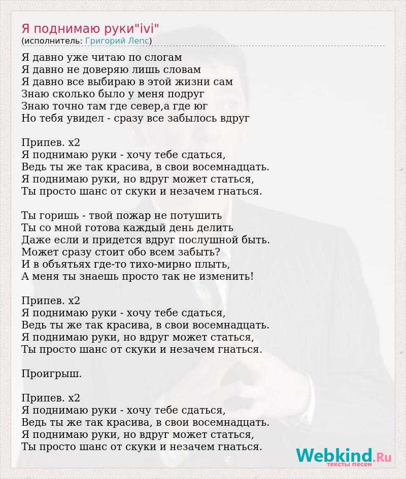 Я давно уже читаю по слогам Я давно не доверяю лишь словам Я давно все выбираю в этой жизни сам Знаю сколько было у меня подруг Знаю точно там где север,а где юг Но тебя увидел - сразу все забылось вдруг Припев. x2 Я поднимаю руки - хочу тебе сдаться, Ведь ты же так красива, в свои восемнадцать. Я поднимаю руки, но вдруг может статься, Ты просто шанс от скуки и незачем гнаться. Ты горишь - твой пожар не потушить Ты со мной готова каждый день делить Даже если и придется вдруг послушной быть. Может сразу стоит обо всем забыть? И в объятьях где-то тихо-мирно плыть, А меня ты знаешь просто так не изменить! Припев. x2 Я поднимаю руки - хочу тебе сдаться, Ведь ты же так красива, в свои восемнадцать. Я поднимаю руки, но вдруг может статься, Ты просто шанс от скуки и незачем гнаться. Проигрыш. Припев. x2 Я поднимаю руки - хочу тебе сдаться, Ведь ты же так красива, в свои восемнадцать. Я поднимаю руки, но вдруг может статься, Ты просто шанс от скуки и незачем гнаться.