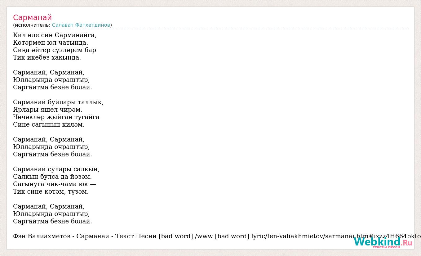 Кил әле син Сарманайга, Көтәрмен юл чатында. Сиңа әйтер сүзләрем бар Тик икебез хакында. Сарманай, Сарманай, Юлларыңда очраштыр, Саргайтма безне болай. Сарманай буйлары таллык, Ярлары яшел чирәм. Чәчәкләр җыйган тугайга Сине сагынып киләм. Сарманай, Сарманай, Юлларыңда очраштыр, Саргайтма безне болай. Сарманай сулары салкын, Салкын булса да йөзәм. Сагынуга чик-чама юк — Тик сине көтәм, түзәм. Сарманай, Сарманай, Юлларыңда очраштыр, Саргайтма безне болай. Фэн Валиахметов - Сарманай - Текст Песни [bad word] /www [bad word] lyric/fen-valiakhmietov/sarmanai.htm#ixzz4H664bkto