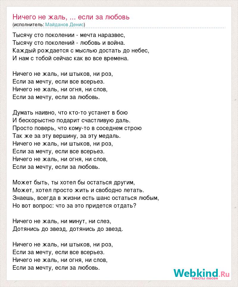 Тысячу сто поколении - мечта наразвес, Тысячу сто поколений - любовь и война. Каждый рождается с мыслью достать до небес, И нам с тобой сейчас как во все времена. Ничего не жаль, ни штыков, ни роз, Если за мечту, если все всерьез. Ничего не жаль, ни огня, ни слов, Если за мечту, если за любовь. Думать наивно, что кто-то устанет в бою И бескорыстно подарит счастливую даль. Просто поверь, что кому-то в соседнем строю Так же за эту вершину, за эту медаль. Ничего не жаль, ни штыков, ни роз, Если за мечту, если все всерьез. Ничего не жаль, ни огня, ни слов, Если за мечту, если за любовь. Может быть, ты хотел бы остаться другим, Может, хотел просто жить и свободно летать. Знаешь, всегда в жизни есть шанс остаться любым, Но вот вопрос: что за это придется отдать? Ничего не жаль, ни минут, ни слез, Дотянись до звезд, дотянись до звезд. Ничего не жаль, ни штыков, ни роз, Если за мечту, если все всерьез. Ничего не жаль, ни огня, ни слов, Если за мечту, если за любовь.