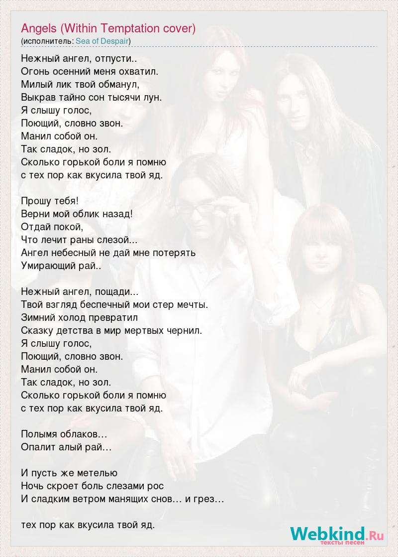 Нежный ангел, отпусти.. Огонь осенний меня охватил. Милый лик твой обманул, Выкрав тайно сон тысячи лун. Я слышу голос, Поющий, словно звон. Манил собой он. Так сладок, но зол. Сколько горькой боли я помню с тех пор как вкусила твой яд. Прошу тебя! Верни мой облик назад! Отдай покой, Что лечит раны слезой... Ангел небесный не дай мне потерять Умирающий рай.. Нежный ангел, пощади... Твой взгляд беспечный мои стер мечты. Зимний холод превратил Сказку детства в мир мертвых чернил. Я слышу голос, Поющий, словно звон. Манил собой он. Так сладок, но зол. Сколько горькой боли я помню с тех пор как вкусила твой яд. Полымя облаков… Опалит алый рай… И пусть же метелью Ночь скроет боль слезами рос И сладким ветром манящих снов… и грез… тех пор как вкусила твой яд.