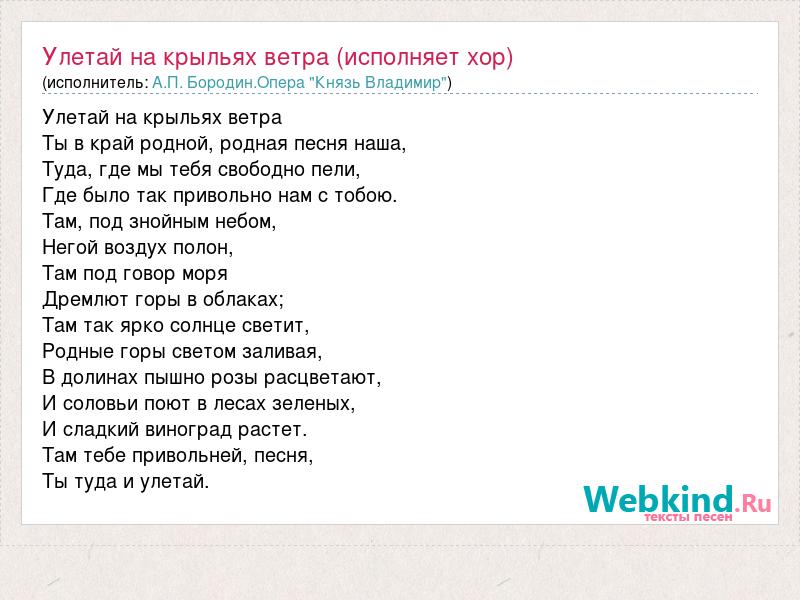 Улетай на крыльях ветра Ты в край родной, родная песня наша, Туда, где мы тебя свободно пели, Где было так привольно нам с тобою. Там, под знойным небом, Негой воздух полон, Там под говор моря Дремлют горы в облаках; Там так ярко солнце светит, Родные горы светом заливая, В долинах пышно розы расцветают, И соловьи поют в лесах зеленых, И сладкий виноград растет. Там тебе привольней, песня, Ты туда и улетай.