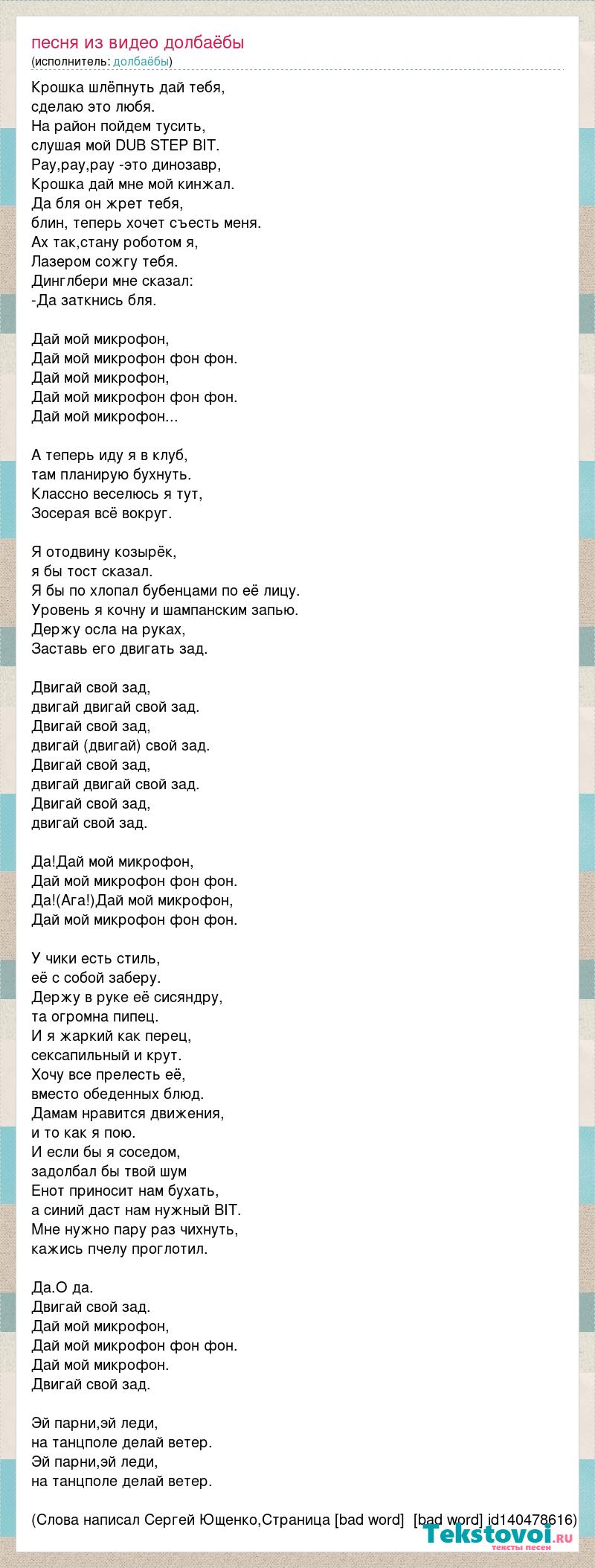 Крошка шлёпнуть дай тебя, сделаю это любя. На район пойдем тусить, слушая мой DUB STEP BIT. Рау,рау,рау -это динозавр, Крошка дай мне мой кинжал. Да бля он жрет тебя, блин, теперь хочет съесть меня. Ах так,стану роботом я, Лазером сожгу тебя. Динглбери мне сказал: -Да заткнись бля. Дай мой микрофон, Дай мой микрофон фон фон. Дай мой микрофон, Дай мой микрофон фон фон. Дай мой микрофон... А теперь иду я в клуб, там планирую бухнуть. Классно веселюсь я тут, Зосерая всё вокруг. Я отодвину козырёк, я бы тост сказал. Я бы по хлопал бубенцами по её лицу. Уровень я кочну и шампанским запью. Держу осла на руках, Заставь его двигать зад. Двигай свой зад, двигай двигай свой зад. Двигай свой зад, двигай (двигай) свой зад. Двигай свой зад, двигай двигай свой зад. Двигай свой зад, двигай свой зад. Да!Дай мой микрофон, Дай мой микрофон фон фон. Да!(Ага!)Дай мой микрофон, Дай мой микрофон фон фон. У чики есть стиль, её с собой заберу. Держу в руке её сисяндру, та огромна пипец. И я жаркий как перец, сексапильный и крут. Хочу все прелесть её, вместо обеденных блюд. Дамам нравится движения, и то как я пою. И если бы я соседом, задолбал бы твой шум Енот приносит нам бухать, а синий даст нам нужный BIT. Мне нужно пару раз чихнуть, кажись пчелу проглотил. Да.О да. Двигай свой зад. Дай мой микрофон, Дай мой микрофон фон фон. Дай мой микрофон. Двигай свой зад. Эй парни,эй леди, на танцполе делай ветер. Эй парни,эй леди, на танцполе делай ветер. (Слова написал Сергей Ющенко,Страница [bad word] [bad word] id140478616)
