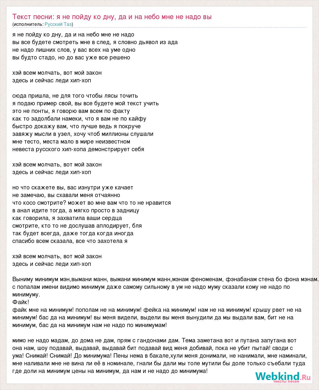 я не пойду ко дну, да и на небо мне не надо вы все будете смотреть мне в след, я словно дьявол из ада не надо лишних слов, у вас всех на уме одно вы будто стадо, но до вас уже все решено хэй всем молчать, вот мой закон здесь и сейчас леди хип-хоп сюда пришла, не для того чтобы лясы точить я подаю пример свой, вы все будете мой текст учить это не понты, я говорю вам всем по факту как то задолбали намеки, что я вам не по кайфу быстро докажу вам, что лучше ведь я покруче завяжу мысли в узел, хочу чтоб миллионы слушали мне тесто, места мало в мире неизвестном невеста русского хип-хопа демонстрирует себя хэй всем молчать, вот мой закон здесь и сейчас леди хип-хоп но что скажете вы, вас изнутри уже качает не замечаю, вы схавали меня отчаянно что косо смотрите? может во мне вам что то не нравится в анал идите тогда, а мягко просто в задницу как говорила, я захватила ваши сердца смотрите, кто то не дослушав аплодирует, бля так будет всегда, даже тогда когда иногда спасибо всем сказала, все что захотела я хэй всем молчать, вот мой закон здесь и сейчас леди хип-хоп Выниму минимум мэн,вымани манн, вымани минимум манн,мэнам феноменам, фэнабанам стена бо фона мэнам. с попалам имени видимо минимум даже самому сильному в ум не надо муму сказали кому не надо по минимуму. Файк! файк мне на минимум! пополам не на минимум! фейка на минимум! нам не на минимум! крышу рвет не на минимум! бас да на минимум! вы меня видели, выдели вы меня вынудили да мы выдали вам, бит не на минимум, бас да на минимум нам не надо по минимумам! мимо не надо мадам, до дома не дам, прям с гандонами дам. Тема заметана вот и путана запутана вот она нам, шоу подавай, выдавай, выдавай бит подавай вид меня добивай, пока не убит пытай! своди с ума! Снимай! Снимай! До минимума! Пены нема в бакале,хули меня донимали, не нанимали, мне наминали, мне наливали мне не вина ли её в номинале, гнали бы дали мы толе мутили бы доле только съебали туда где доли на минимум цены на минимум, да нам и не надо до минимума!