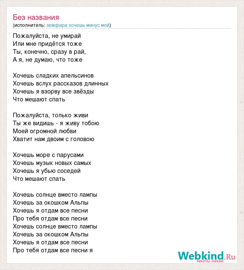 Пожалуйста, не умирай Или мне придётся тоже Ты, конечно, сразу в рай, А я, не думаю, что тоже Хочешь сладких апельсинов Хочешь вслух рассказов длинных Хочешь я взорву все звёзды Что мешают спать Пожалуйста, только живи Ты же видишь - я живу тобою Моей огромной любви Хватит нам двоим с головою Хочешь море с парусами Хочешь музык новых самых Хочешь я убью соседей Что мешают спать Хочешь солнце вместо лампы Хочешь за окошком Альпы Хочешь я отдам все песни Про тебя отдам все песни Хочешь солнце вместо лампы Хочешь за окошком Альпы Хочешь я отдам все песни Про тебя отдам все песни я