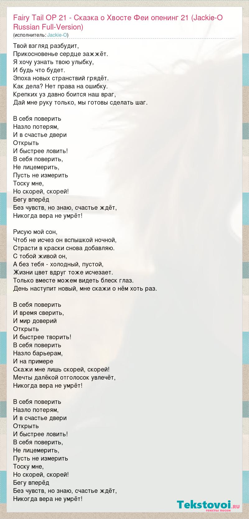 А как ты думаешь, о чем песня "Fairy Tail OP 21 - Сказка о Хвосте Феи опенинг 21 (Jackie-O Russian Full" ?