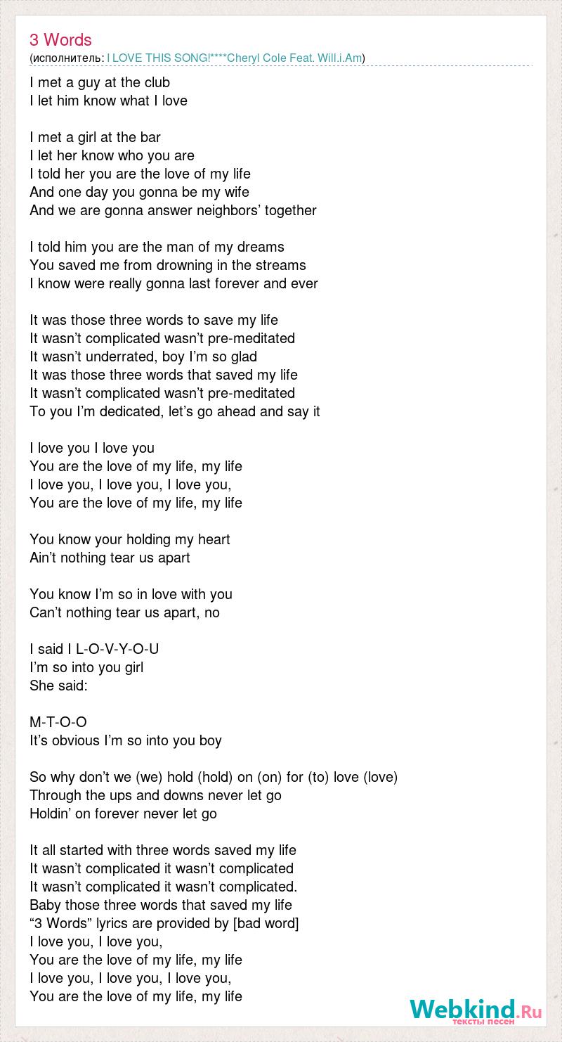 I met a guy at the club I let him know what I love I met a girl at the bar I let her know who you are I told her you are the love of my life And one day you gonna be my wife And we are gonna answer neighbors’ together I told him you are the man of my dreams You saved me from drowning in the streams I know were really gonna last forever and ever It was those three words to save my life It wasn’t complicated wasn’t pre-meditated It wasn’t underrated, boy I’m so glad It was those three words that saved my life It wasn’t complicated wasn’t pre-meditated To you I’m dedicated, let’s go ahead and say it I love you I love you You are the love of my life, my life I love you, I love you, I love you, You are the love of my life, my life You know your holding my heart Ain’t nothing tear us apart You know I’m so in love with you Can’t nothing tear us apart, no I said I L-O-V-Y-O-U I’m so into you girl She said: M-T-O-O It’s obvious I’m so into you boy So why don’t we (we) hold (hold) on (on) for (to) love (love) Through the ups and downs never let go Holdin’ on forever never let go It all started with three words saved my life It wasn’t complicated it wasn’t complicated It wasn’t complicated it wasn’t complicated. Baby those three words that saved my life “3 Words” lyrics are provided by [bad word] I love you, I love you, You are the love of my life, my life I love you, I love you, I love you, You are the love of my life, my life