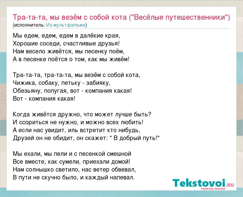 Мы едем, едем, едем в далёкие края, Хорошие соседи, счастливые друзья! Нам весело живётся, мы песенку поём, А в песенке поётся о том, как мы живём! Тра-та-та, тра-та-та, мы везём с собой кота, Чижика, собаку, петьку - забияку, Обезьяну, попугая, вот - компания какая! Вот - компания какая! Когда живётся дружно, что может лучше быть? И ссориться не нужно, и можно всех любить! А если нас увидит, иль встретит кто нибудь, Друзей он не обидит, он скажет: " В добрый путь!" Мы ехали, мы пели и с песенкой смешной Все вместе, как сумели, приехали домой! Нам солнышко светило, нас ветер обвевал, В пути не скучно было, и каждый напевал.