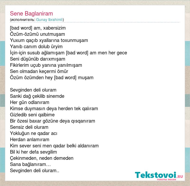 Vurulmuşam, xabersizim Özüm-özümü unutmuşam Yuxum qaçıb xyallarına toxunmuşam Yanıb canım dolub üryim İçin-için susub ağlamışam Yorulmuşam men her gece Seni düşünüb darıxmışam Fikirlerim uçub yanına yanılmışam Sen olmadan keçermi ömür Özüm özümden hey soruşmuşam Sevginden deli oluram Sanki dağ çekilib sinemde Her gün odlanıram Kimse duymasın deya herden tek qalıram Gizledib seni qalbime Bir özesi baxar gözüne deya qısqanıram Sensiz deli oluram Yokluğun ne qadar acı Herdan anlamıram Kim sever seni men qadar belki aldanıram Bil ki her defa sevgilim Çekinmeden, neden demeden Sana bağlanıram… Sevginden deli oluram..