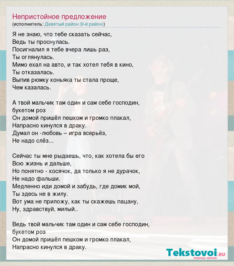 Я не знаю, что тебе сказать сейчас, Ведь ты проснулась. Посигналил я тебе вчера лишь раз, Ты оглянулась. Мимо ехал на авто, и так хотел тебя в кино, Ты отказалась. Выпив рюмку коньяка ты стала проще, Чем казалась. А твой мальчик там один и сам себе господин, букетом роз Он домой пришёл пешком и громко плакал, Напрасно кинулся в драку. Думал он -любовь – игра всерьёз, Не надо слёз... Сейчас ты мне рыдаешь, что, как хотела бы его Всю жизнь и дальше, Но понятно - косячок, да только я не дурачок, Не надо фальши. Медленно иди домой и забудь, где домик мой, Ты здесь не в жилу. Вот ума не приложу, как ты скажешь пацану, Ну, здравствуй, милый.. Ведь твой мальчик там один и сам себе господин, букетом роз Он домой пришёл пешком и громко плакал, Напрасно кинулся в драку.