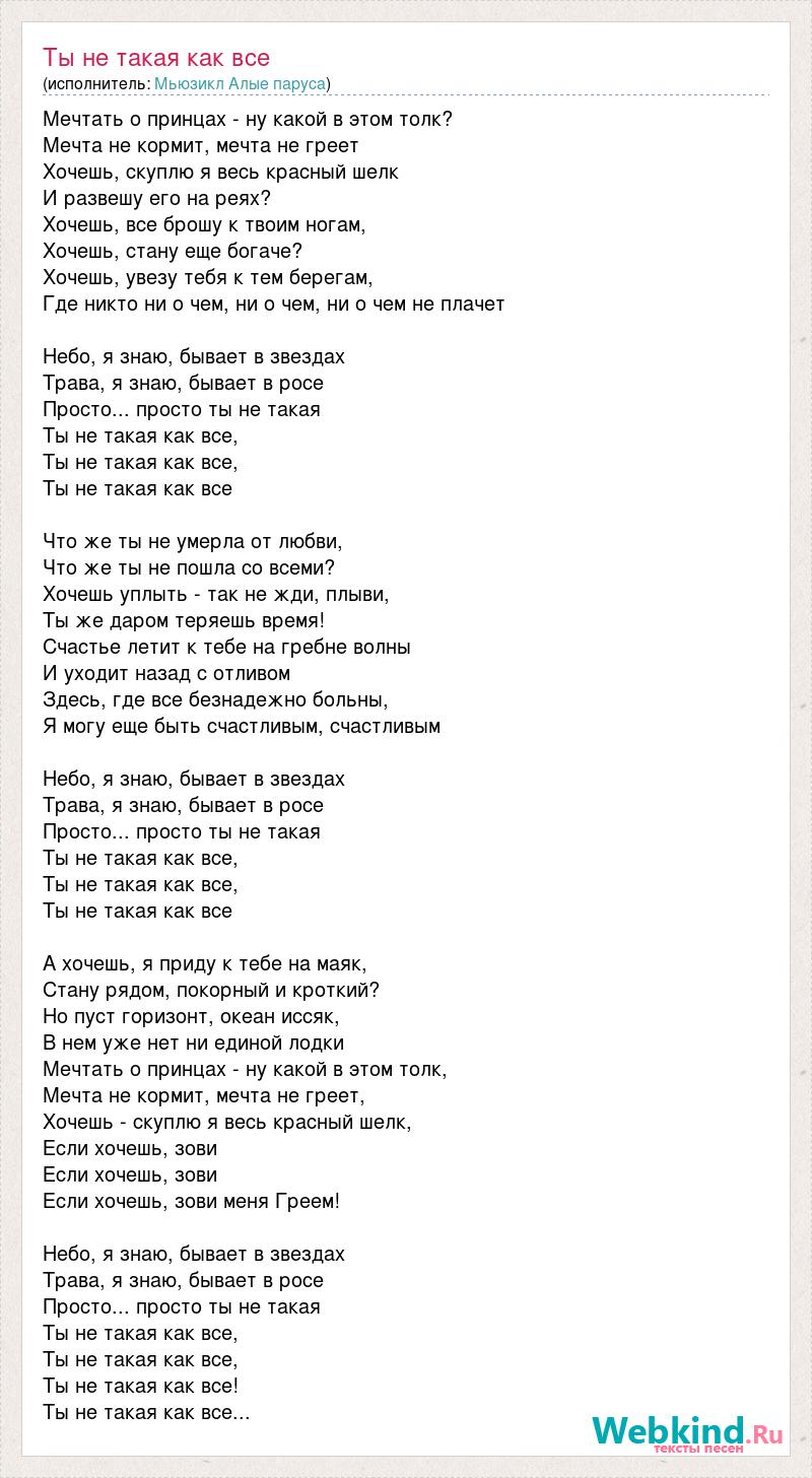 Мечтать о принцах - ну какой в этом толк? Мечта не кормит, мечта не греет Хочешь, скуплю я весь красный шелк И развешу его на реях? Хочешь, все брошу к твоим ногам, Хочешь, стану еще богаче? Хочешь, увезу тебя к тем берегам, Где никто ни о чем, ни о чем, ни о чем не плачет Небо, я знаю, бывает в звездах Трава, я знаю, бывает в росе Просто... просто ты не такая Ты не такая как все, Ты не такая как все, Ты не такая как все Что же ты не умерла от любви, Что же ты не пошла со всеми? Хочешь уплыть - так не жди, плыви, Ты же даром теряешь время! Счастье летит к тебе на гребне волны И уходит назад с отливом Здесь, где все безнадежно больны, Я могу еще быть счастливым, счастливым Небо, я знаю, бывает в звездах Трава, я знаю, бывает в росе Просто... просто ты не такая Ты не такая как все, Ты не такая как все, Ты не такая как все А хочешь, я приду к тебе на маяк, Стану рядом, покорный и кроткий? Но пуст горизонт, океан иссяк, В нем уже нет ни единой лодки Мечтать о принцах - ну какой в этом толк, Мечта не кормит, мечта не греет, Хочешь - скуплю я весь красный шелк, Если хочешь, зови Если хочешь, зови Если хочешь, зови меня Греем! Небо, я знаю, бывает в звездах Трава, я знаю, бывает в росе Просто... просто ты не такая Ты не такая как все, Ты не такая как все, Ты не такая как все! Ты не такая как все...