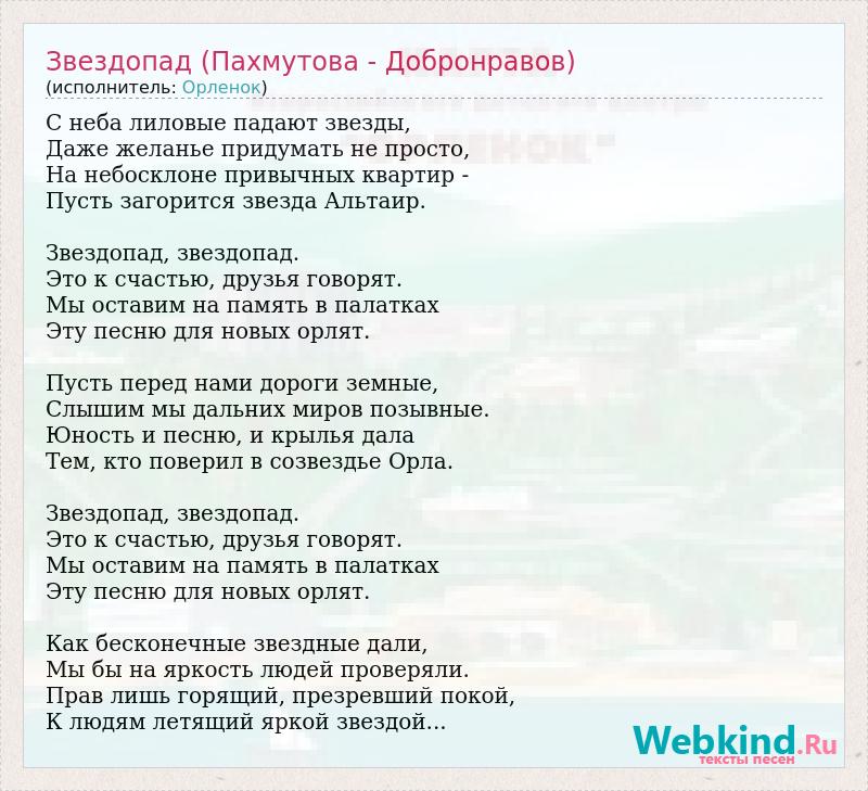 С неба лиловые падают звезды, Даже желанье придумать не просто, На небосклоне привычных квартир - Пусть загорится звезда Альтаир. Звездопад, звездопад. Это к счастью, друзья говорят. Мы оставим на память в палатках Эту песню для новых орлят. Пусть перед нами дороги земные, Слышим мы дальних миров позывные. Юность и песню, и крылья дала Тем, кто поверил в созвездье Орла. Звездопад, звездопад. Это к счастью, друзья говорят. Мы оставим на память в палатках Эту песню для новых орлят. Как бесконечные звездные дали, Мы бы на яркость людей проверяли. Прав лишь горящий, презревший покой, К людям летящий яркой звездой...