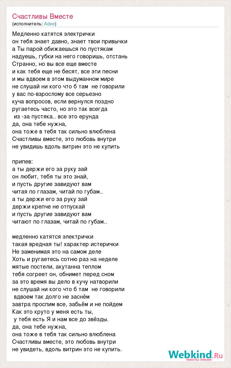 Медленно катятся электрички он тебя знает давно, знает твои привычки а Ты парой обижаешься по пустякам надуешь, губки на него говоришь, отстань Странно, но вы все еще вместе и как тебя еще не бесят, все эти песни и мы вдвоем в этом выдуманном мире не слушай ни кого что б там не говорили у вас по-взрослому все серьезно куча вопросов, если вернулся поздно ругаетесь часто, но это так всегда из -за пустяка.. все это ерунда да, она тебе нужна, она тоже в тебя так сильно влюблена Счастливы вместе, это любовь внутри не увидишь вдоль витрин это не купить припев: а ты держи его за руку зай он любит, тебя ты это знай, и пусть другие завидуют вам читая по глазам, читай по губам.. а ты держи его за руку зай держи крепче не отпускай и пусть другие завидуют вам читают по глазам, читай по губам.. медленно катятся электрички такая вредная ты! характер истерички Не заменимая это на самом деле Хоть и ругаетесь сотню раз на неделе мятые постели, акутанна теплом тебя согреет он, обнимет перед сном за это время вы дело в кучу натворили не слушай ни кого что б там не говорили вдвоем так долго не заснём завтра проспим все, забьём и не пойдем Как это круто у меня есть ты, у тебя есть Я и нам все до звёзды. да, она тебе нужна, она тоже в тебя так сильно влюблена Счастливы вместе, это любовь внутри не увидеть, вдоль витрин это не купить.
