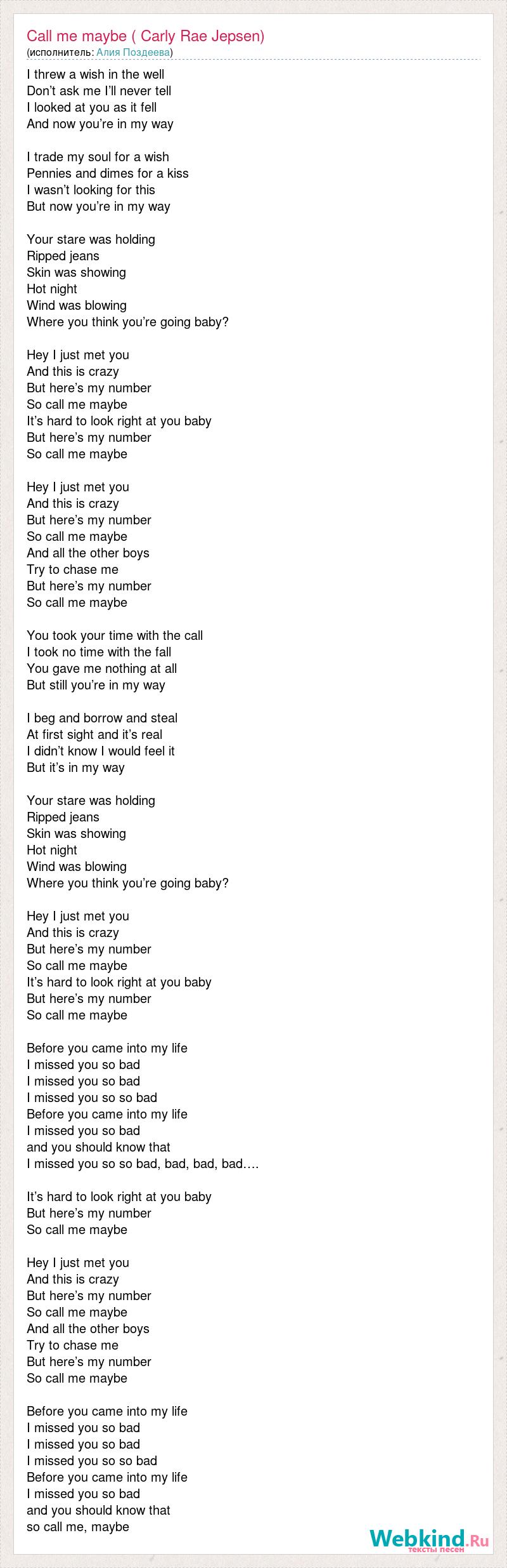 I threw a wish in the well Don’t ask me I’ll never tell I looked at you as it fell And now you’re in my way I trade my soul for a wish Pennies and dimes for a kiss I wasn’t looking for this But now you’re in my way Your stare was holding Ripped jeans Skin was showing Hot night Wind was blowing Where you think you’re going baby? Hey I just met you And this is crazy But here’s my number So call me maybe It’s hard to look right at you baby But here’s my number So call me maybe Hey I just met you And this is crazy But here’s my number So call me maybe And all the other boys Try to chase me But here’s my number So call me maybe You took your time with the call I took no time with the fall You gave me nothing at all But still you’re in my way I beg and borrow and steal At first sight and it’s real I didn’t know I would feel it But it’s in my way Your stare was holding Ripped jeans Skin was showing Hot night Wind was blowing Where you think you’re going baby? Hey I just met you And this is crazy But here’s my number So call me maybe It’s hard to look right at you baby But here’s my number So call me maybe Before you came into my life I missed you so bad I missed you so bad I missed you so so bad Before you came into my life I missed you so bad and you should know that I missed you so so bad, bad, bad, bad…. It’s hard to look right at you baby But here’s my number So call me maybe Hey I just met you And this is crazy But here’s my number So call me maybe And all the other boys Try to chase me But here’s my number So call me maybe Before you came into my life I missed you so bad I missed you so bad I missed you so so bad Before you came into my life I missed you so bad and you should know that so call me, maybe