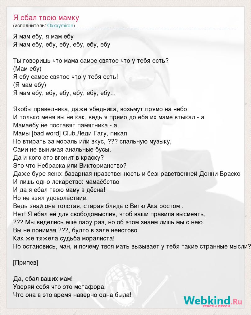 Я мам ебу, я мам ебу Я мам ебу, ебу, ебу, ебу, ебу, ебу Ты говоришь что мама самое святое что у тебя есть? (Мам ебу) Я ебу самое святое что у тебя есть! (Я мам ебу) Я мам ебу, ебу, ебу, ебу, ебу, ебу... Якобы праведника, даже ябедника, возьмут прямо на небо И только меня вы не как, ведь я прямо до ёба их маме втыкал - а Мамаёбу не поставят памятника - а Мамы [bad word] Club,Леди Гагу, пикап Но втирать за мораль или вкус, ??? спальную музыку, Сами не вынимая анальные бусы. Да и кого это вгонит в краску? Это что Небраска или Викторианство? Даже буре ясно: базарная нравственность и безнравственней Донни Браско И лишь одно лекарство: мамаёбство И да я ебал твою маму в дёсна! Но не взял удовольствие, Ведь знай она толстая, старая блядь с Витю Ака ростом : Нет! Я ебал её для свободомыслия, чтоб ваши правила высмеять, ??? Мы виделись ещё пару раз, но об этом знаем лишь мы с нею. Вы не понимая ???, будто в зале неистово Как же тяжела судьба моралиста! Но остановись, ман, и почему твоя мать вызывает у тебя такие странные мысли? [Припев] Да, ебал ваших мам! Уверяй себя что это метафора, Что она в это время наверно одна была!