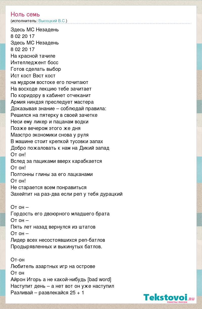 Здесь МС Незадень 8 02 20 17 Здесь МС Незадень 8 02 20 17 На красной тачиле Интелледжент босс Готов сделать выбор Ист кост Вэст кост на мудром востоке его почитают На восходе лекцию тебе зачитает По коридору в кабинет отчеканит Армия ниндзя преследует мастера Доказывая знание – соблюдай правила: Решился на пятерку в своей зачетке Неси ему ликер и пацанам водки Позже вечером этого же дня Маэстро экономики снова у руля В машине стоит крепкой тусовки запах Добро пожаловать к нам на Дикий запад От он! Вслед за пациками вверх карабкается От он! Полтонны глины за его лацканами От он! Не старается всем понравиться Захейтит на раз-два если реп у тебя дурацкий От он – Гордость его двоюрного младшего брата От он – Пять лет назад вернулся из штатов От он – Лидер всех несостоявшихся реп-батлов Продырявленных и выкинутых батлов. От-он Любитель азартных игр на острове От он Айрон Игорь а не какой-нибудь [bad word] Наступит день – а нет вот он уже наступил Разливай – развлекайся 25 + 1