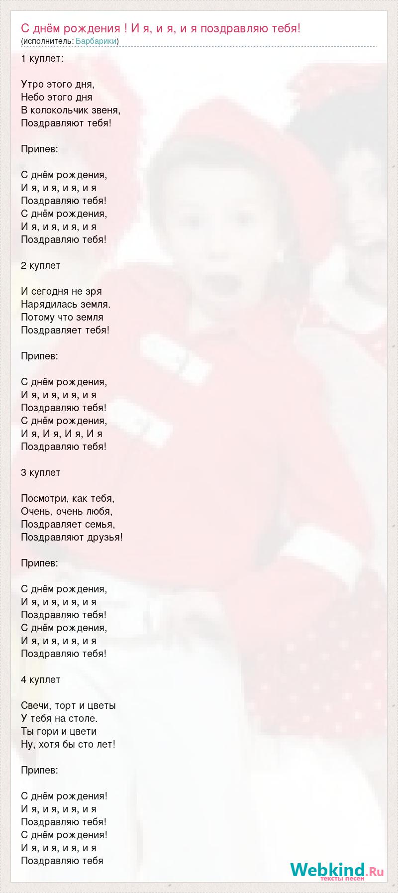 1 куплет: Утро этого дня, Небо этого дня В колокольчик звеня, Поздравляют тебя! Припев: С днём рождения, И я, и я, и я, и я Поздравляю тебя! С днём рождения, И я, и я, и я, и я Поздравляю тебя! 2 куплет И сегодня не зря Нарядилась земля. Потому что земля Поздравляет тебя! Припев: С днём рождения, И я, и я, и я, и я Поздравляю тебя! С днём рождения, И я, И я, И я, И я Поздравляю тебя! 3 куплет Посмотри, как тебя, Очень, очень любя, Поздравляет семья, Поздравляют друзья! Припев: С днём рождения, И я, и я, и я, и я Поздравляю тебя! С днём рождения, И я, и я, и я, и я Поздравляю тебя! 4 куплет Свечи, торт и цветы У тебя на столе. Ты гори и цвети Ну, хотя бы сто лет! Припев: С днём рождения! И я, и я, и я, и я Поздравляю тебя! С днём рождения! И я, и я, и я, и я Поздравляю тебя