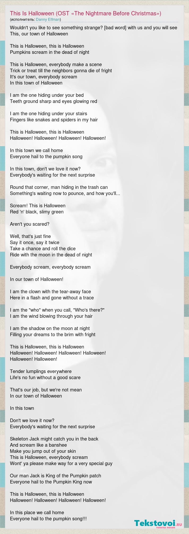 Wouldn't you like to see something strange? Come with us and you will see This, our town of Halloween This is Halloween, this is Halloween Pumpkins scream in the dead of night This is Halloween, everybody make a scene Trick or treat till the neighbors gonna die of fright It's our town, everybody scream In this town of Halloween I am the one hiding under your bed Teeth ground sharp and eyes glowing red I am the one hiding under your stairs Fingers like snakes and spiders in my hair This is Halloween, this is Halloween Halloween! Halloween! Halloween! Halloween! In this town we call home Everyone hail to the pumpkin song In this town, don't we love it now? Everybody's waiting for the next surprise Round that corner, man hiding in the trash can Something's waiting now to pounce, and how you'll... Scream! This is Halloween Red 'n' black, slimy green Aren't you scared? Well, that's just fine Say it once, say it twice Take a chance and roll the dice Ride with the moon in the dead of night Everybody scream, everybody scream In our town of Halloween! I am the clown with the tear-away face Here in a flash and gone without a trace I am the "who" when you call, "Who's there?" I am the wind blowing through your hair I am the shadow on the moon at night Filling your dreams to the brim with fright This is Halloween, this is Halloween Halloween! Halloween! Halloween! Halloween! Halloween! Halloween! Tender lumplings everywhere Life's no fun without a good scare That's our job, but we're not mean In our town of Halloween In this town Don't we love it now? Everybody's waiting for the next surprise Skeleton Jack might catch you in the back And scream like a banshee Make you jump out of your skin This is Halloween, everybody scream Wont' ya please make way for a very special guy Our man Jack is King of the Pumpkin patch Everyone hail to the Pumpkin King now This is Halloween, this is Halloween Halloween! Halloween! Halloween! Halloween! In this place we call home Everyone hail to the pumpkin song!!!