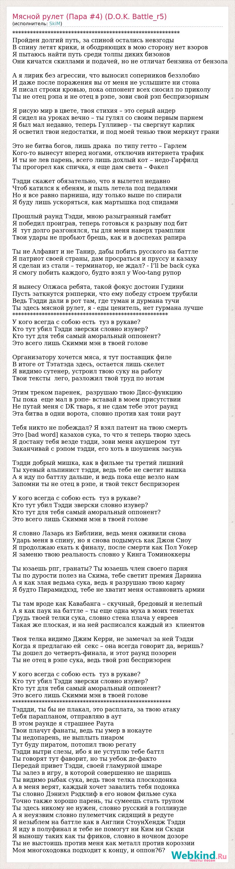 ********************************************************* Пройден долгий путь, за спиной остались невзгоды В спину летят крики, и ободряющих в мою сторону нет взоров Я пытаюсь найти путь среди толпы диких бизонов Они кичатся скиллами и подачей, но не отличат бензина от бензола А я лирик без агрессии, что выносил соперников беззлобно И даже после поражения вы от меня не услышите ни стона Я писал строки кровью, пока оппонент всех сносил по приколу Ты не отец рэпа и не отец в рэпе, зови свой рэп беспризорным Я рисую мир в цвете, твоя стихия – это серый андер Я сидел на уроках вечно – ты гулял со своим первым парнем Я был мал недавно, теперь Гулливер - ты свергнут карлик Я осветил твои недостатки, и под моей тенью твои меркнут грани Это не битва богов, лишь драка по типу гетто – Гарлем Кого-то вынесут вперед ногами, отключив интернета трафик И ты не лев парень, всего лишь дохлый кот – недо-Гарфилд Ты прогорел как спичка, я еще дам света – Факел Тэдди скажет обязательно, что я вылетел недавно Чтоб катился к ебеням, и пыль летела под педалями Но я все равно парниша, иду только выше по спирали Я буду лишь ускоряться, как мартышка под спидами Прошлый раунд Тэдди, мною разыгранный гамбит Я победил проиграв, теперь готовься к разрыву под бит Я тут долго разгонялся, ты для меня наверх трамплин Твои удары не пробьют брешь, как и в доспехах рапира Ты не Алфавит и не Танир, дабы побить русского на баттле Я патриот своей страны, дам просраться и пруссу и казаху Я сделан из стали – терминатор, не ждал? - I’ll be back сука Я смогу побить каждого, будто взял у Woo-tang рупор Я вынесу Олжаса ребята, такой фокус достоин Гудини Пусть заткнутся рэпперки, что ему победу строем трубили Ведь Тэдди дали в рот там, где туман и дурмана тучи Ты здесь мясной рулет, я - еды ценитель, нет гурмана лучше ***************************************************** У кого всегда с собою есть туз в рукаве? Кто тут убил Тэдди зверски словно изувер? Кто тут для тебя самый аморальный оппонент? Это всего лишь Скимми мэн в твоей голове Организатору хочется мяса, я тут поставщик филе В итоге от Тэтатэда здесь, остается лишь скелет Я видимо сутенер, устроил твою суку на работу Твои тексты лего, разложил твой труд по нотам Этим треком паренек, разрушаю твою Дисс-функцию Ты пока еще мал в рэпе- вставай в моем присутствии Не путай меня с DK тварь, я не сдам тебе этот раунд Эта битва в одни ворота, словно против хая тони раут Тебя никто не побеждал? Я взял патент на твою смерть Это [bad word] казахов сука, то что я теперь творю здесь Я достану тебя везде тэдди, зови меня акушером тут Заканчивай с рэпом тэдди, его хоть в шоушенк засунь Тэдди добрый мишка, как в фильме ты третий лишний Ты хуевый альпинист тэдди, ведь тебе не светит вышка А я иду по баттлу дальше, и ведь пока еще везло нам Запомни ты не отец в рэпе, и твой текст беспризорен У кого всегда с собою есть туз в рукаве? Кто тут убил Тэдди зверски словно изувер? Кто тут для тебя самый аморальный оппонент? Это всего лишь Скимми мэн в твоей голове Я словно Лазарь из Библиии, ведь меня оживили снова Ударь меня в спину, но я снова подымусь как Джон Сноу Я продолжаю ехать к финалу, после смерти как Пол Уокер Я заменю твою реальность словно у Кинга Томиноккеры Ты юзаешь рпг, гранаты? Ты юзаешь член своего парня Ты по дурости полез на Скима, тебе светит премия Дарвина А я как злая ведьма сука, ведь я разрушаю твою карму Я будто Пирамидх