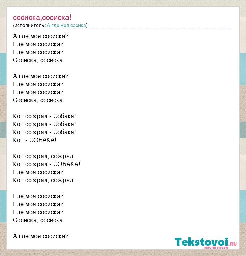 А где моя сосиска? Где моя сосиска? Где моя сосиска? Сосиска, сосиска. А где моя сосиска? Где моя сосиска? Где моя сосиска? Сосиска, сосиска. Кот сожрал - Собака! Кот сожрал - Собака! Кот сожрал - Собака! Кот - СОБАКА! Кот сожрал, сожрал Кот сожрал - СОБАКА! Где моя сосиска? Кот сожрал, сожрал Где моя сосиска? Где моя сосиска? Где моя сосиска? Сосиска, сосиска. А где моя сосиска?