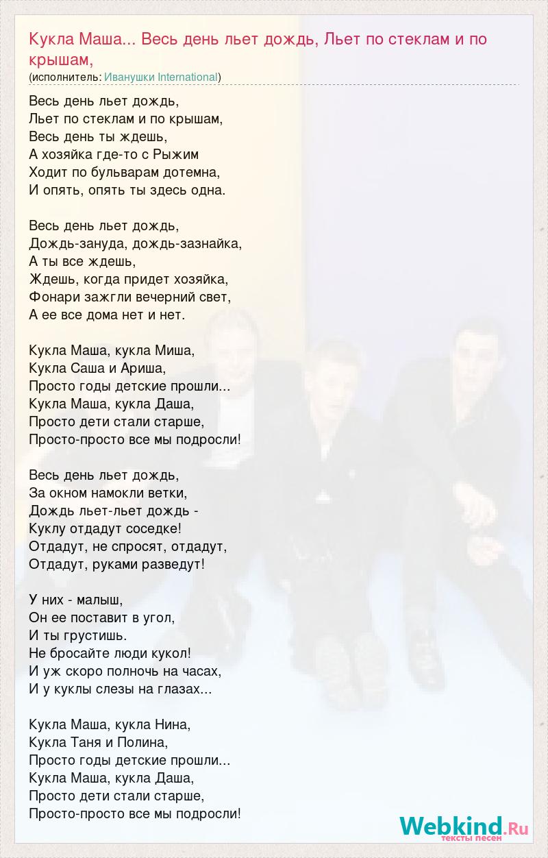 Весь день льет дождь, Льет по стеклам и по крышам, Весь день ты ждешь, А хозяйка где-то с Рыжим Ходит по бульварам дотемна, И опять, опять ты здесь одна. Весь день льет дождь, Дождь-зануда, дождь-зазнайка, А ты все ждешь, Ждешь, когда придет хозяйка, Фонари зажгли вечерний свет, А ее все дома нет и нет. Кукла Маша, кукла Миша, Кукла Саша и Ариша, Просто годы детские прошли... Кукла Маша, кукла Даша, Просто дети стали старше, Просто-просто все мы подросли! Весь день льет дождь, За окном намокли ветки, Дождь льет-льет дождь - Куклу отдадут соседке! Отдадут, не спросят, отдадут, Отдадут, руками разведут! У них - малыш, Он ее поставит в угол, И ты грустишь. Не бросайте люди кукол! И уж скоро полночь на часах, И у куклы слезы на глазах... Кукла Маша, кукла Нина, Кукла Таня и Полина, Просто годы детские прошли... Кукла Маша, кукла Даша, Просто дети стали старше, Просто-просто все мы подросли!