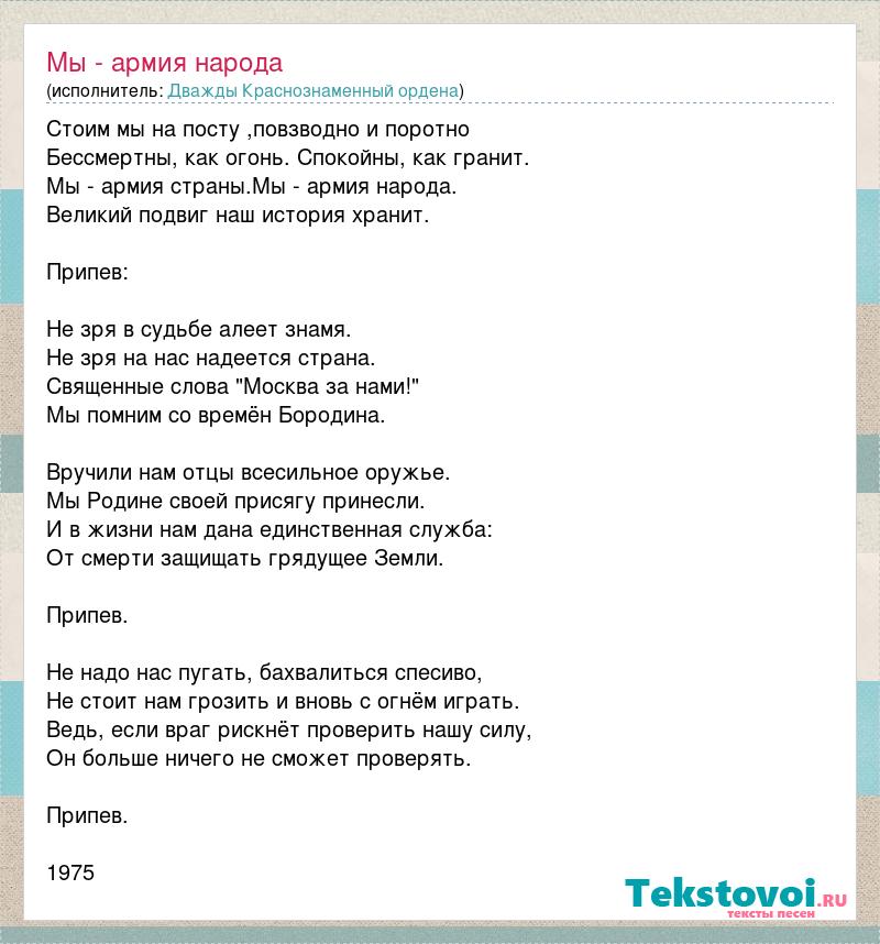 Стоим мы на посту ,повзводно и поротно Бессмертны, как огонь. Спокойны, как гранит. Мы - армия страны.Мы - армия народа. Великий подвиг наш история хранит. Припев: Не зря в судьбе алеет знамя. Не зря на нас надеется страна. Священные слова "Москва за нами!" Мы помним со времён Бородина. Вручили нам отцы всесильное оружье. Мы Родине своей присягу принесли. И в жизни нам дана единственная служба: От смерти защищать грядущее Земли. Припев. Не надо нас пугать, бахвалиться спесиво, Не стоит нам грозить и вновь с огнём играть. Ведь, если враг рискнёт проверить нашу силу, Он больше ничего не сможет проверять. Припев. 1975
