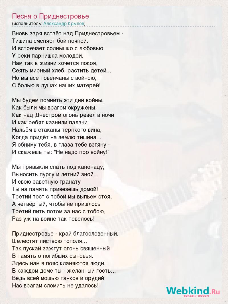 Вновь заря встаёт над Приднестровьем - Тишина сменяет бой ночной. И встречает солнышко с любовью У реки парнишка молодой. Нам так в жизни хочется покоя, Сеять мирный хлеб, растить детей... Но мы все повенчаны с войною, С болью в душах наших матерей! Мы будем помнить эти дни войны, Как были мы врагом окружены. Как над Днестром огонь ревел в ночи И как ребят казнили палачи. Нальём в стаканы терпкого вина, Когда придёт на землю тишина... Я обниму тебя, в глаза тебе взгяну - И скажешь ты: "Не надо про войну!" Мы привыкли спать под канонаду, Выносить пургу и летний зной... И свою заветную гранату Ты на память привезёшь домой! Третий тост с тобой мы выпьем стоя, А четвёртый, чтобы не пришлось Третий пить потом за нас с тобою, Раз уж на войне так повелось! Приднестровье - край благословенный. Шелестят листвою тополя... Так пускай зажгут огонь священный В память о погибших сыновья. Здесь нам в пояс кланяются люди, В каждом доме ты - желанный гость... Ведь всей мощью танков и орудий Нас врагам сломить не удалось!