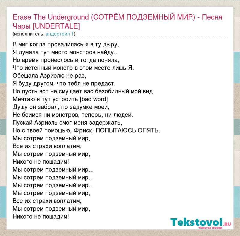 В миг когда провалилась я в ту дыру, Я думала тут много монстров найду.. Но время пронеслось и тогда поняла, Что истенный монстр в этом месте лишь Я. Обещала Азриэлю не раз, Я буду другом, что тебя не предаст. Но пусть вот не смущает вас безобидный мой вид Мечтаю я тут устроить [bad word] Душу он забрал, по задумке моей, Не боимся ни монстров, теперь, ни людей. Пускай Азриэль смог меня задержать, Но с твоей помощью, Фриск, ПОПЫТАЮСЬ ОПЯТЬ. Мы сотрем подземный мир, Все их страхи воплатим, Мы сотрем подземный мир, Никого не пощадим! Мы сотрем подземный мир... Мы сотрем подземный мир... Мы сотрем подземный мир... Мы сотрем подземный мир, Все их страхи воплатим, Мы сотрем подземный мир, Никого не пощадим!