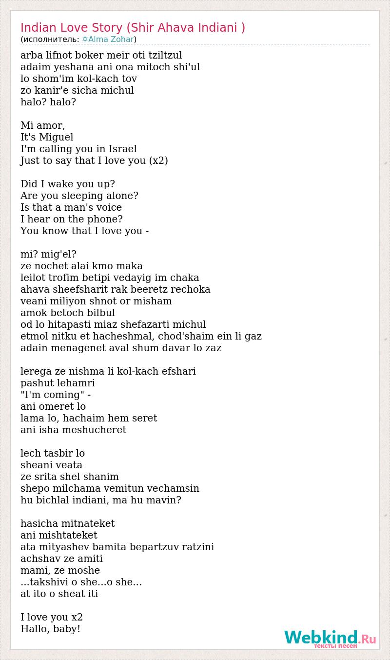 arba lifnot boker meir oti tziltzul adaim yeshana ani ona mitoch shi'ul lo shom'im kol-kach tov zo kanir'e sicha michul halo? halo? Mi amor, It's Miguel I'm calling you in Israel Just to say that I love you (x2) Did I wake you up? Are you sleeping alone? Is that a man's voice I hear on the phone? You know that I love you - mi? mig'el? ze nochet alai kmo maka leilot trofim betipi vedayig im chaka ahava sheefsharit rak beeretz rechoka veani miliyon shnot or misham amok betoch bilbul od lo hitapasti miaz shefazarti michul etmol nitku et hacheshmal, chod'shaim ein li gaz adain menagenet aval shum davar lo zaz lerega ze nishma li kol-kach efshari pashut lehamri "I'm coming" - ani omeret lo lama lo, hachaim hem seret ani isha meshucheret lech tasbir lo sheani veata ze srita shel shanim shepo milchama vemitun vechamsin hu bichlal indiani, ma hu mavin? hasicha mitnateket ani mishtateket ata mityashev bamita bepartzuv ratzini achshav ze amiti mami, ze moshe ...takshivi o she...o she... at ito o sheat iti I love you x2 Hallo, baby!