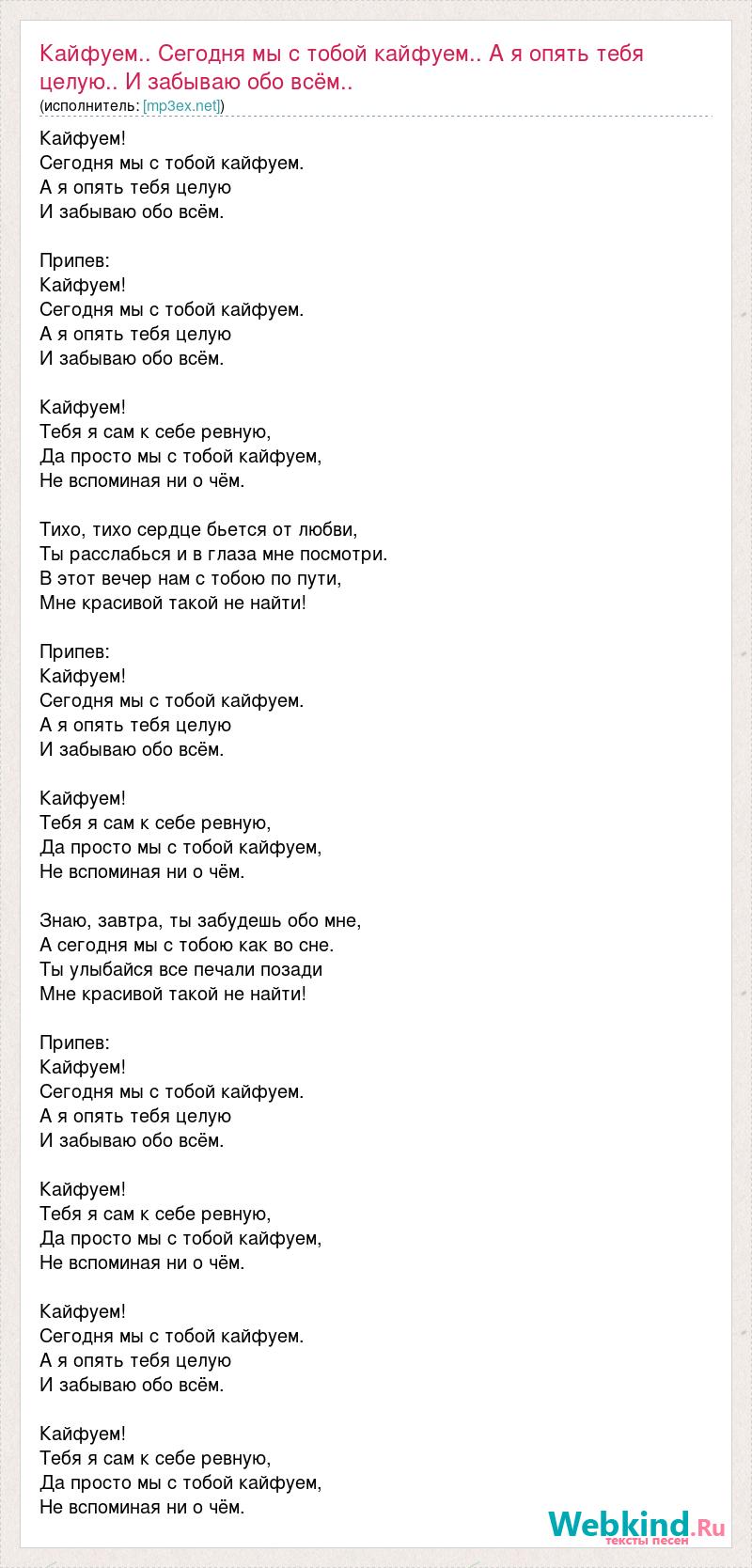 Кайфуем! Сегодня мы с тобой кайфуем. А я опять тебя целую И забываю обо всём. Припев: Кайфуем! Сегодня мы с тобой кайфуем. А я опять тебя целую И забываю обо всём. Кайфуем! Тебя я сам к себе ревную, Да просто мы с тобой кайфуем, Не вспоминая ни о чём. Тихо, тихо сердце бьется от любви, Ты расслабься и в глаза мне посмотри. В этот вечер нам с тобою по пути, Мне красивой такой не найти! Припев: Кайфуем! Сегодня мы с тобой кайфуем. А я опять тебя целую И забываю обо всём. Кайфуем! Тебя я сам к себе ревную, Да просто мы с тобой кайфуем, Не вспоминая ни о чём. Знаю, завтра, ты забудешь обо мне, А сегодня мы с тобою как во сне. Ты улыбайся все печали позади Мне красивой такой не найти! Припев: Кайфуем! Сегодня мы с тобой кайфуем. А я опять тебя целую И забываю обо всём. Кайфуем! Тебя я сам к себе ревную, Да просто мы с тобой кайфуем, Не вспоминая ни о чём. Кайфуем! Сегодня мы с тобой кайфуем. А я опять тебя целую И забываю обо всём. Кайфуем! Тебя я сам к себе ревную, Да просто мы с тобой кайфуем, Не вспоминая ни о чём.