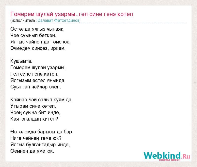 Өстәлдә ялгыз чынаяк, Чәе суынып беткән. Ялгыз чәйнең дә тәме юк, Эчмәдем синсез, иркәм. Кушымта. Гомерем шулай узармы, Гел сине генә көтеп. Ялгызым өстәл янында Суынган чәйләр эчеп. Кайнар чәй салып куям да Утырам сине көтеп. Чәең суына бит инде, Кая югалдың китеп? Өстәлемдә барысы да бар, Нигә чәйнең тәме юк? Ялгыз булгангадыр инде, Өемнең дә яме юк.