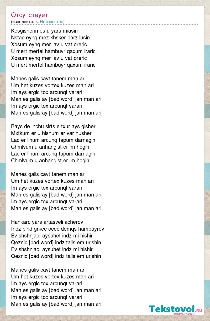 Kesgisherin es u yars miasin Nstac eynq mez khsker parz lusin Xosum eynq mer lav u vat oreric U mert mertel hambuyr qaxum iraric Xosum eynq mer lav u vat oreric U mert mertel hambuyr qaxum iraric Manes galis cavt tanem man ari Um het kuzes vortex kuzes man ari Im ays ergic tox arcunqt varari Man es galis ay sirun jan man ari Im ays ergic tox arcunqt varari Man es galis ay sirun jan man ari Bayc de inchu sirts e txur ays gisher Mxtkum er u hishum er var husher Lac er linum arcunq tapum darnagin Chmlvum u anhangist er im hogin Lac er linum arcunq tapum darnagin Chmlvum u anhangist er im hogin Manes galis cavt tanem man ari Um het kuzes vortex kuzes man ari Im ays ergic tox arcunqt varari Man es galis ay sirun jan man ari Im ays ergic tox arcunqt varari Man es galis ay sirun jan man ari Hankarc yars artasveli acherov Indz pind grkec ocec demqs hambuyrov Ev shshnjac, aysuhet indz mi hishir Qeznic heru indz talis em urishin Ev shshnjac, aysuhet indz mi hishir Qeznic heru indz talis em urishin Manes galis cavt tanem man ari Um het kuzes vortex kuzes man ari Im ays ergic tox arcunqt varari Man es galis ay sirun jan man ari Im ays ergic tox arcunqt varari Man es galis ay sirun jan man ari