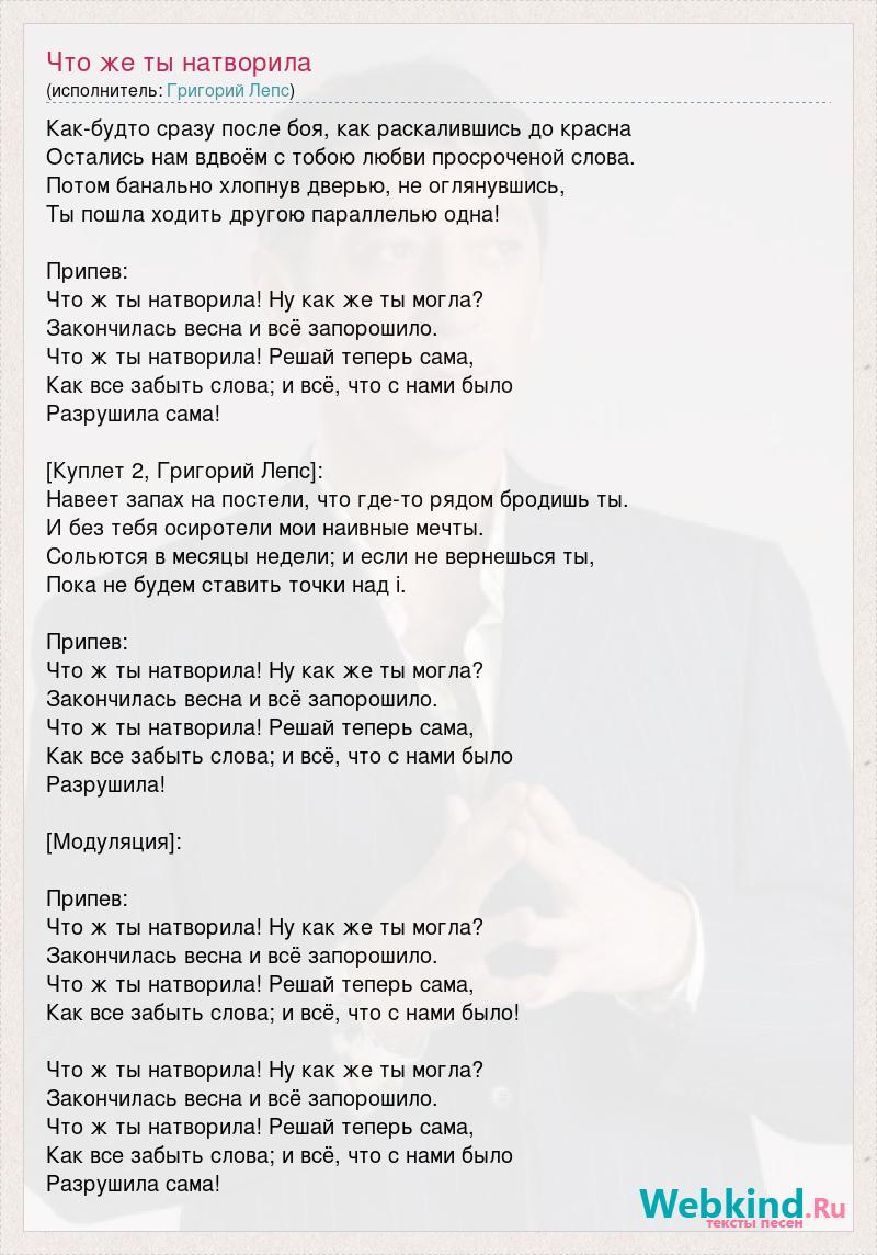 Как-будто сразу после боя, как раскалившись до красна Остались нам вдвоём с тобою любви просроченой слова. Потом банально хлопнув дверью, не оглянувшись, Ты пошла ходить другою параллелью одна! Припев: Что ж ты натворила! Ну как же ты могла? Закончилась весна и всё запорошило. Что ж ты натворила! Решай теперь сама, Как все забыть слова; и всё, что с нами было Разрушила сама! [Куплет 2, Григорий Лепс]: Навеет запах на постели, что где-то рядом бродишь ты. И без тебя осиротели мои наивные мечты. Сольются в месяцы недели; и если не вернешься ты, Пока не будем ставить точки над i. Припев: Что ж ты натворила! Ну как же ты могла? Закончилась весна и всё запорошило. Что ж ты натворила! Решай теперь сама, Как все забыть слова; и всё, что с нами было Разрушила! [Модуляция]: Припев: Что ж ты натворила! Ну как же ты могла? Закончилась весна и всё запорошило. Что ж ты натворила! Решай теперь сама, Как все забыть слова; и всё, что с нами было! Что ж ты натворила! Ну как же ты могла? Закончилась весна и всё запорошило. Что ж ты натворила! Решай теперь сама, Как все забыть слова; и всё, что с нами было Разрушила сама!