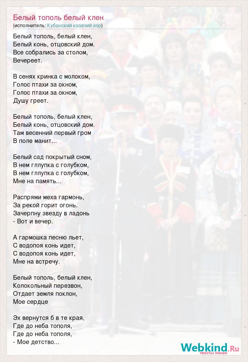 Белый тополь, белый клен, Белый конь, отцовский дом. Все собрались за столом, Вечереет. В сенях кринка с молоком, Голос птахи за окном, Голос птахи за окном, Душу греет. Белый тополь, белый клен, Белый конь, отцовский дом. Там весенний первый гром В поле манит... Белый сад покрытый сном, В нем гллупка с голубком, В нем гллупка с голубком, Мне на память... Распрями меха гармонь, За рекой горит огонь. Зачерпну звезду в ладонь - Вот и вечер. А гармошка песню льет, С водопоя конь идет, С водопоя конь идет, Мне на встречу. Белый тополь, белый клен, Колокольный перезвон, Отдает земля поклон, Мое сердце Эх вернутся б в те края, Где до неба тополя, Где до неба тополя, - Мое детство...