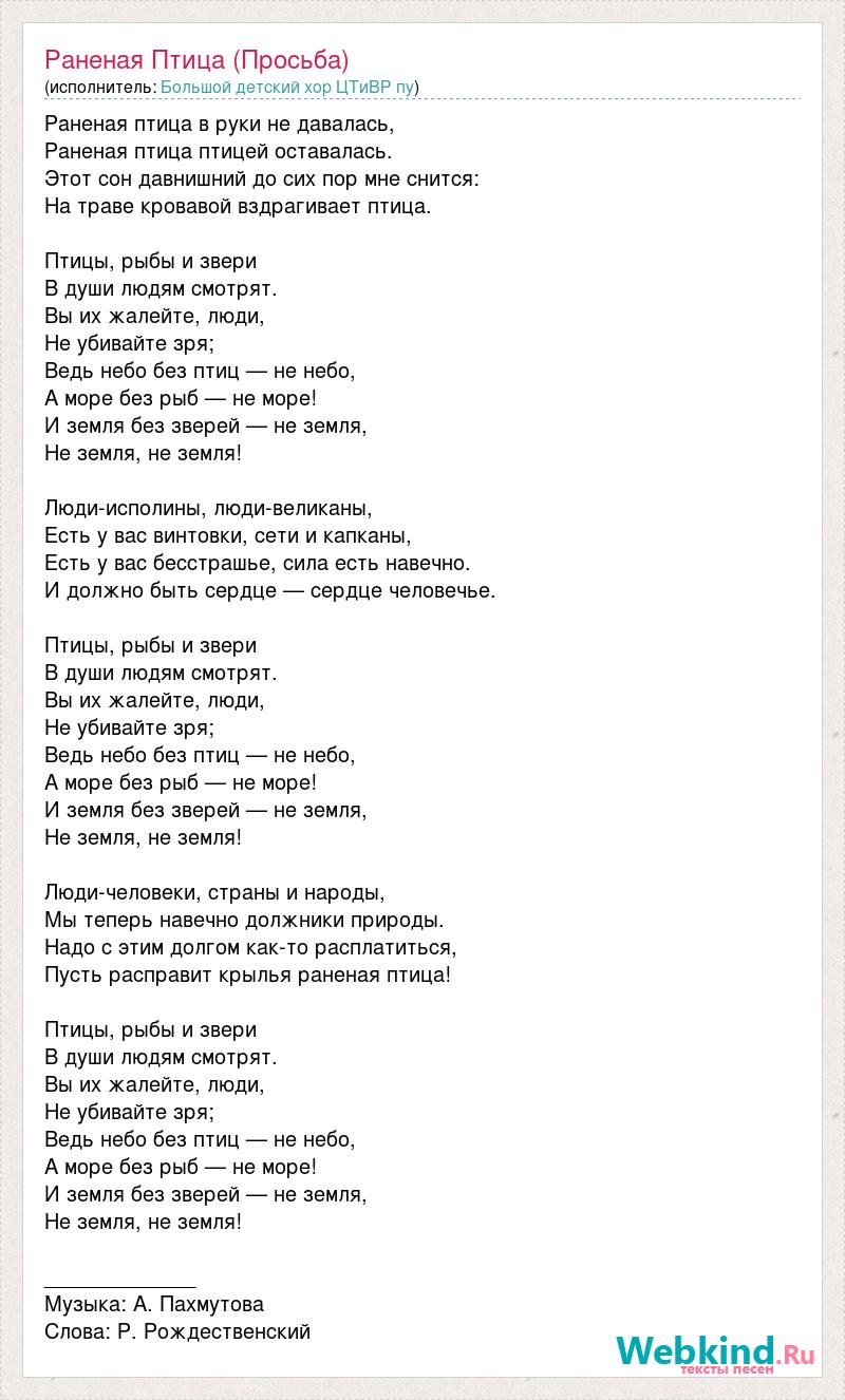 Раненая птица в руки не давалась, Раненая птица птицей оставалась. Этот сон давнишний до сих пор мне снится: На траве кровавой вздрагивает птица. Птицы, рыбы и звери В души людям смотрят. Вы их жалейте, люди, Не убивайте зря; Ведь небо без птиц — не небо, А море без рыб — не море! И земля без зверей — не земля, Не земля, не земля! Люди-исполины, люди-великаны, Есть у вас винтовки, сети и капканы, Есть у вас бесстрашье, сила есть навечно. И должно быть сердце — сердце человечье. Птицы, рыбы и звери В души людям смотрят. Вы их жалейте, люди, Не убивайте зря; Ведь небо без птиц — не небо, А море без рыб — не море! И земля без зверей — не земля, Не земля, не земля! Люди-человеки, страны и народы, Мы теперь навечно должники природы. Надо с этим долгом как-то расплатиться, Пусть расправит крылья раненая птица! Птицы, рыбы и звери В души людям смотрят. Вы их жалейте, люди, Не убивайте зря; Ведь небо без птиц — не небо, А море без рыб — не море! И земля без зверей — не земля, Не земля, не земля! _____________ Музыка: А. Пахмутова Слова: Р. Рождественский