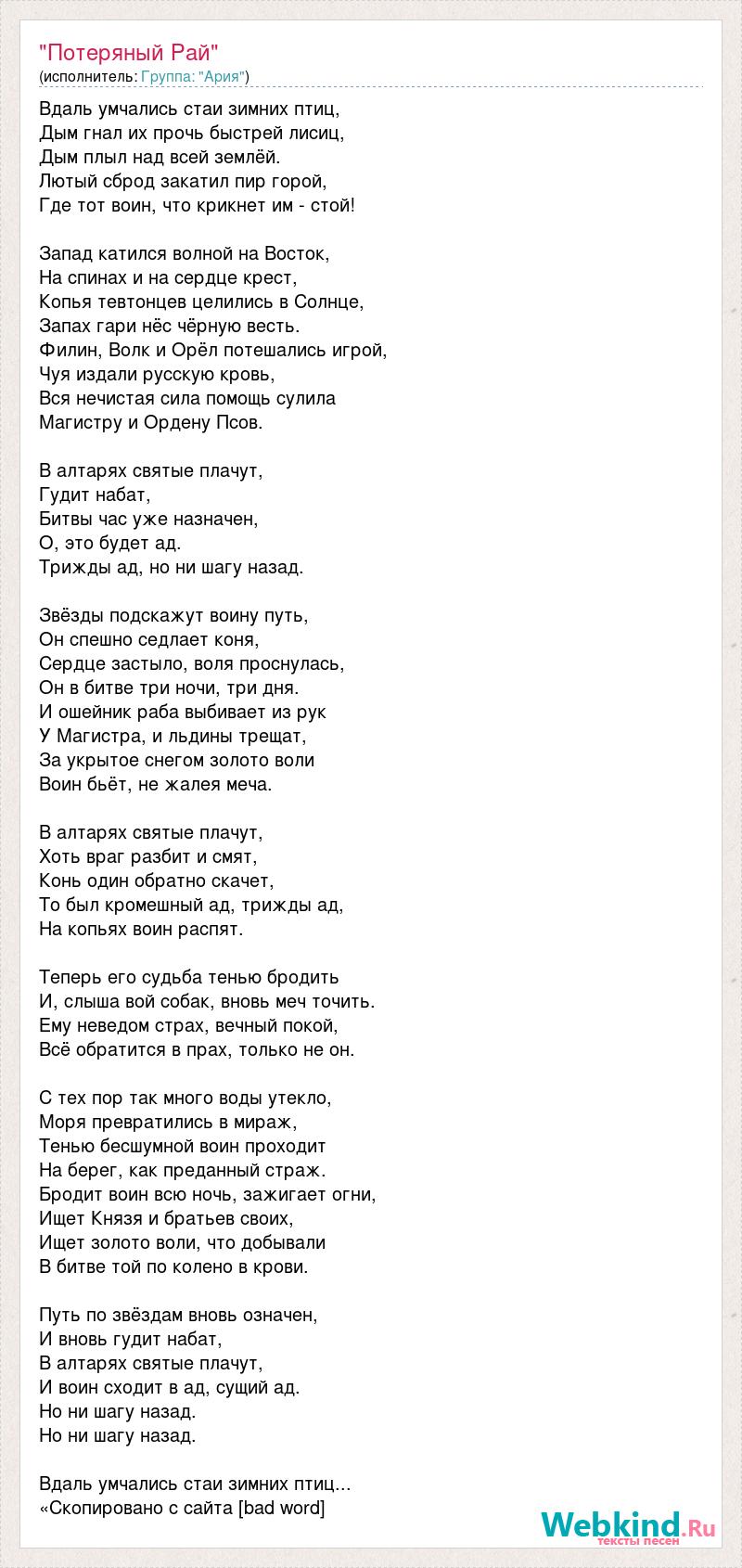 Вдаль умчались стаи зимних птиц, Дым гнал их прочь быстрей лисиц, Дым плыл над всей землёй. Лютый сброд закатил пир горой, Где тот воин, что крикнет им - стой! Запад катился волной на Восток, На спинах и на сердце крест, Копья тевтонцев целились в Солнце, Запах гари нёс чёрную весть. Филин, Волк и Орёл потешались игрой, Чуя издали русскую кровь, Вся нечистая сила помощь сулила Магистру и Ордену Псов. В алтарях святые плачут, Гудит набат, Битвы час уже назначен, О, это будет ад. Трижды ад, но ни шагу назад. Звёзды подскажут воину путь, Он спешно седлает коня, Сердце застыло, воля проснулась, Он в битве три ночи, три дня. И ошейник раба выбивает из рук У Магистра, и льдины трещат, За укрытое снегом золото воли Воин бьёт, не жалея меча. В алтарях святые плачут, Хоть враг разбит и смят, Конь один обратно скачет, То был кромешный ад, трижды ад, На копьях воин распят. Теперь его судьба тенью бродить И, слыша вой собак, вновь меч точить. Ему неведом страх, вечный покой, Всё обратится в прах, только не он. С тех пор так много воды утекло, Моря превратились в мираж, Тенью бесшумной воин проходит На берег, как преданный страж. Бродит воин всю ночь, зажигает огни, Ищет Князя и братьев своих, Ищет золото воли, что добывали В битве той по колено в крови. Путь по звёздам вновь означен, И вновь гудит набат, В алтарях святые плачут, И воин сходит в ад, сущий ад. Но ни шагу назад. Но ни шагу назад. Вдаль умчались стаи зимних птиц... «Скопировано с сайта [bad word]