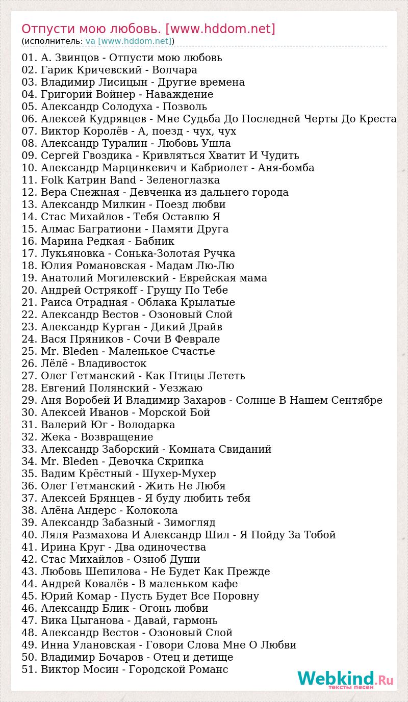 01. А. Звинцов - Отпусти мою любовь 02. Гарик Кричевский - Волчара 03. Владимир Лисицын - Другие времена 04. Григорий Войнер - Наваждение 05. Александр Солодуха - Позволь 06. Алексей Кудрявцев - Мне Судьба До Последней Черты До Креста 07. Виктор Королёв - А, поезд - чух, чух 08. Александр Туралин - Любовь Ушла 09. Сергей Гвоздика - Кривляться Хватит И Чудить 10. Александр Марцинкевич и Кабриолет - Аня-бомба 11. Folk Катрин Band - Зеленоглазка 12. Вера Снежная - Девченка из дальнего города 13. Александр Милкин - Поезд любви 14. Стас Михайлов - Тебя Оставлю Я 15. Алмас Багратиони - Памяти Друга 16. Марина Редкая - Бабник 17. Лукьяновка - Сонька-Золотая Ручка 18. Юлия Романовская - Мадам Лю-Лю 19. Анатолий Могилевский - Еврейская мама 20. Андрей Острякоff - Грущу По Тебе 21. Раиса Отрадная - Облака Крылатые 22. Александр Вестов - Озоновый Слой 23. Александр Курган - Дикий Драйв 24. Вася Пряников - Сочи В Феврале 25. Mr. Bleden - Маленькое Счастье 26. Лёлё - Владивосток 27. Олег Гетманский - Как Птицы Лететь 28. Евгений Полянский - Уезжаю 29. Аня Воробей И Владимир Захаров - Солнце В Нашем Сентябре 30. Алексей Иванов - Морской Бой 31. Валерий Юг - Володарка 32. Жека - Возвращение 33. Александр Заборский - Комната Свиданий 34. Mr. Bleden - Девочка Скрипка 35. Вадим Крёстный - Шухер-Мухер 36. Олег Гетманский - Жить Не Любя 37. Алексей Брянцев - Я буду любить тебя 38. Алёна Андерс - Колокола 39. Александр Забазный - Зимогляд 40. Ляля Размахова И Александр Шил - Я Пойду За Тобой 41. Ирина Круг - Два одиночества 42. Стас Михайлов - Озноб Души 43. Любовь Шепилова - Не Будет Как Прежде 44. Андрей Ковалёв - В маленьком кафе 45. Юрий Комар - Пусть Будет Все Поровну 46. Александр Блик - Огонь любви 47. Вика Цыганова - Давай, гармонь 48. Александр Вестов - Озоновый Слой 49. Инна Улановская - Говори Слова Мне О Любви 50. Владимир Бочаров - Отец и детище 51. Виктор Мосин - Городской Романс