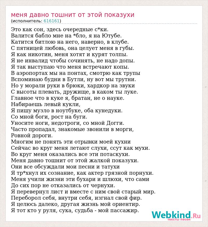 Это как сон, здесь очередные с*ки. Валится бабло мне на *бло, я на Ютубе. Катится битлою на него, наверно, в клубе. С пятницей любовь, она целует меня в губы. Я как никотин, меня хотят и курят толпы. Я не инвалид чтобы сочинять, не надо допы. Я так выступаю что меня встречают копы. В аэропортах мы на понтах, смотрю как трупы Вспоминаю будни в Бутли, ну вот мы трутни. Но у морали руки в брюки, хардкор на звуки С высоты плевать, дружище, в каком ты луке. Главное что в куке я, братан, не о науке. Набираешь левый кукли, Я пишу музло в ноутбуке, оба кунедуки. Со мной боги, рост на буги. Уносите ноги, недотроги, со мной Догги. Часто пропадал, знакомые звонили в морги, Ровной дороги. Многим не понять эти отрывки моей кухни Сейчас во круг меня летают слухи, ссут как мухи. Во круг меня оказались все эти потаскухи. Меня давно тошнит от этой жалкой показухи. Они все обсуждали мои песни и татухи Я тр*хнул их сознание, как актер грязной порнухи. Меня учили жизни эти бухари и шлюхи, что сами До сих пор не отказались от чернухи. Я перевернул лист и вместе с ним свой старый мир. Переборол себя, внутри себя, изгнал свой фир. Я целюсь далеко, другая жизнь мой ориентир. Я тот кто у руля, сука, судьба - мой пассажир.