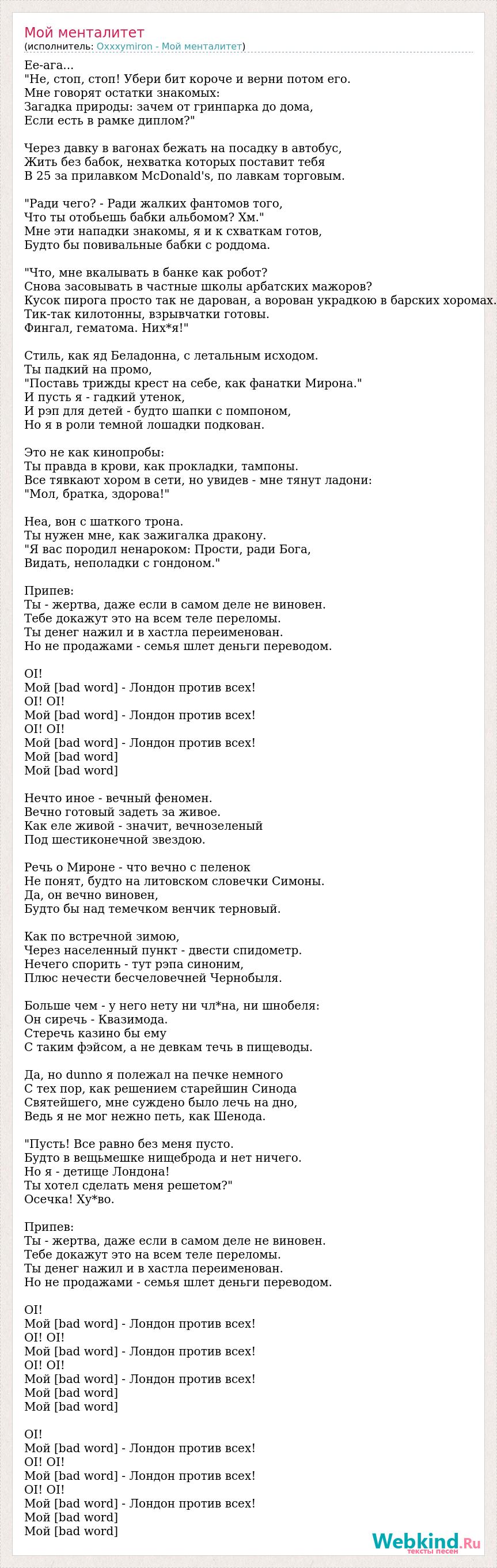 Ее-ага... "Не, стоп, стоп! Убери бит короче и верни потом его. Мне говорят остатки знакомых: Загадка природы: зачем от гринпарка до дома, Если есть в рамке диплом?" Через давку в вагонах бежать на посадку в автобус, Жить без бабок, нехватка которых поставит тебя В 25 за прилавком McDonald's, по лавкам торговым. "Ради чего? - Ради жалких фантомов того, Что ты отобьешь бабки альбомом? Хм." Мне эти нападки знакомы, я и к схваткам готов, Будто бы повивальные бабки с роддома. "Что, мне вкалывать в банке как робот? Снова засовывать в частные школы арбатских мажоров? Кусок пирога просто так не дарован, а ворован украдкою в барских хоромах. Тик-так килотонны, взрывчатки готовы. Фингал, гематома. Них*я!" Стиль, как яд Беладонна, с летальным исходом. Ты падкий на промо, "Поставь трижды крест на себе, как фанатки Мирона." И пусть я - гадкий утенок, И рэп для детей - будто шапки с помпоном, Но я в роли темной лошадки подкован. Это не как кинопробы: Ты правда в крови, как прокладки, тампоны. Все тявкают хором в сети, но увидев - мне тянут ладони: "Мол, братка, здорова!" Неа, вон с шаткого трона. Ты нужен мне, как зажигалка дракону. "Я вас породил ненароком: Прости, ради Бога, Видать, неполадки с гондоном." Припев: Ты - жертва, даже если в самом деле не виновен. Тебе докажут это на всем теле переломы. Ты денег нажил и в хастла переименован. Но не продажами - семья шлет деньги переводом. OI! Мой [bad word] - Лондон против всех! OI! OI! Мой [bad word] - Лондон против всех! OI! OI! Мой [bad word] - Лондон против всех! Мой [bad word] Мой [bad word] Нечто иное - вечный феномен. Вечно готовый задеть за живое. Как еле живой - значит, вечнозеленый Под шестиконечной звездою. Речь о Мироне - что вечно с пеленок Не понят, будто на литовском словечки Симоны. Да, он вечно виновен, Будто бы над темечком венчик терновый. Как по встречной зимою, Через населенный пункт - двести спидометр. Нечего спорить - тут рэпа синоним, Плюс нечести бесчеловечней Чернобыля. Больше чем - у него нету ни чл*на, ни шнобеля: Он сиречь - Квазимода. Стеречь казино бы ему С таким фэйсом, а не девкам течь в пищеводы. Да, но dunno я полежал на печке немного С тех пор, как решением старейшин Синода Святейшего, мне суждено было лечь на дно, Ведь я не мог нежно петь, как Шенода. "Пусть! Все равно без меня пусто. Будто в вещьмешке нищеброда и нет ничего. Но я - детище Лондона! Ты хотел сделать меня решетом?" Осечка! Ху*во. Припев: Ты - жертва, даже если в самом деле не виновен. Тебе докажут это на всем теле переломы. Ты денег нажил и в хастла переименован. Но не продажами - семья шлет деньги переводом. OI! Мой [bad word] - Лондон против всех! OI! OI! Мой [bad word] - Лондон против всех! OI! OI! Мой [bad word] - Лондон против всех! Мой [bad word] Мой [bad word] OI! Мой [bad word] - Лондон против всех! OI! OI! Мой [bad word] - Лондон против всех! OI! OI! Мой [bad word] - Лондон против всех! Мой [bad word] Мой [bad word]