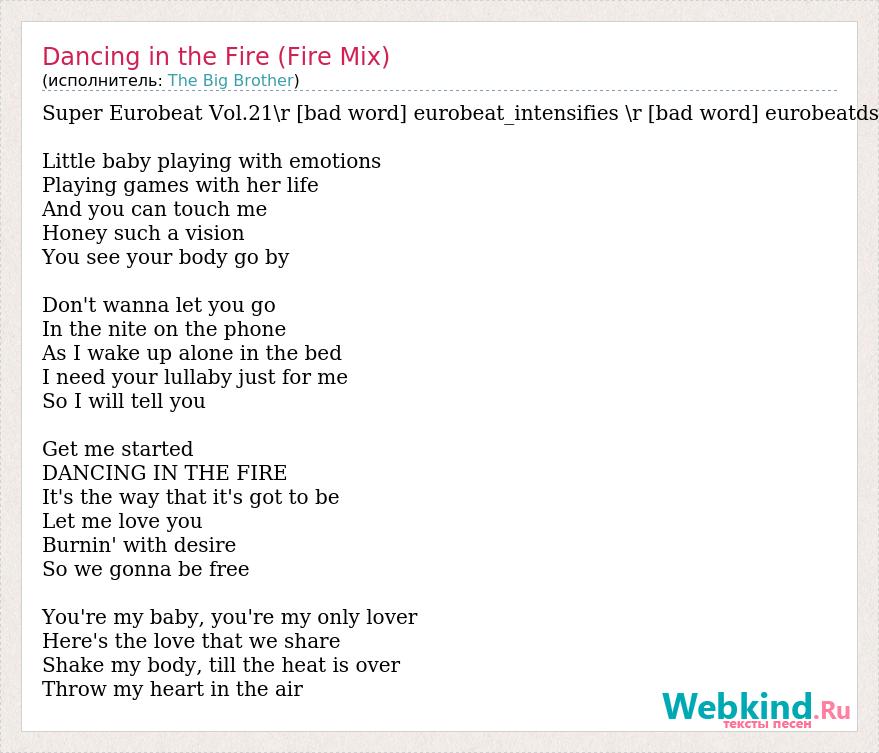 Super Eurobeat Vol.21\r [bad word] eurobeat_intensifies \r [bad word] eurobeatds Little baby playing with emotions Playing games with her life And you can touch me Honey such a vision You see your body go by Don't wanna let you go In the nite on the phone As I wake up alone in the bed I need your lullaby just for me So I will tell you Get me started DANCING IN THE FIRE It's the way that it's got to be Let me love you Burnin' with desire So we gonna be free You're my baby, you're my only lover Here's the love that we share Shake my body, till the heat is over Throw my heart in the air