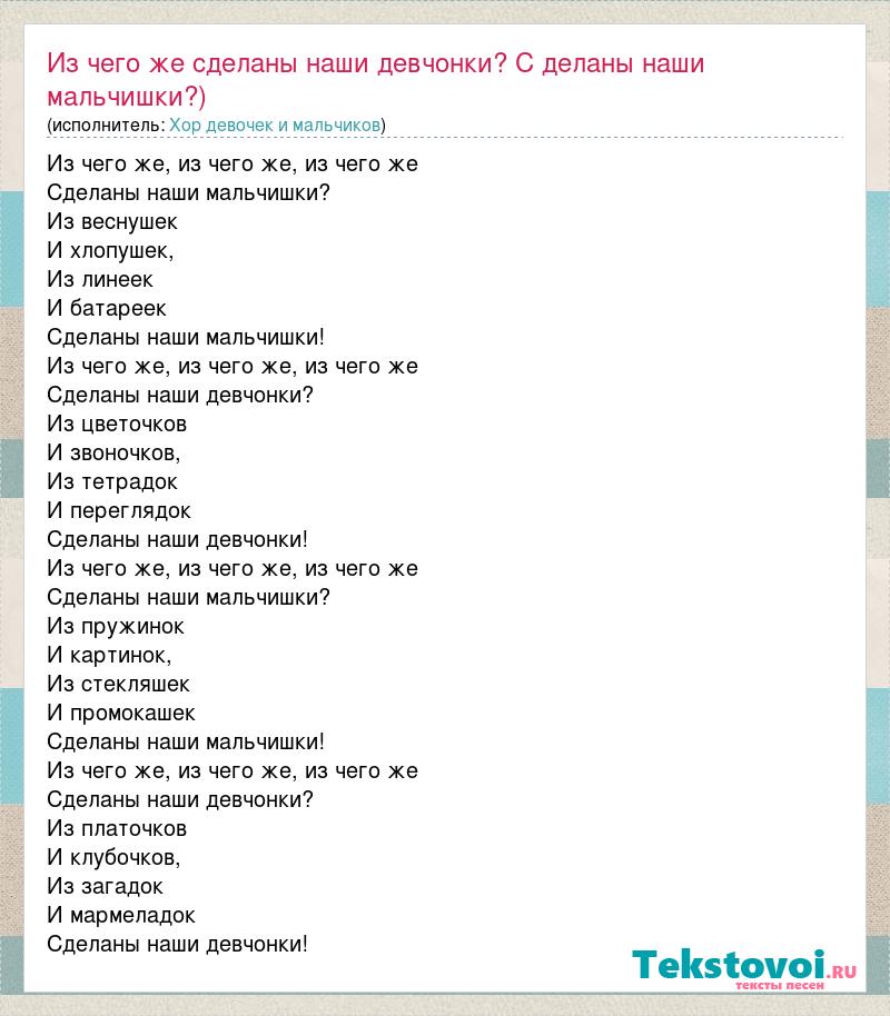 Из чего же, из чего же, из чего же Сделаны наши мальчишки? Из веснушек И хлопушек, Из линеек И батареек Сделаны наши мальчишки! Из чего же, из чего же, из чего же Сделаны наши девчонки? Из цветочков И звоночков, Из тетрадок И переглядок Сделаны наши девчонки! Из чего же, из чего же, из чего же Сделаны наши мальчишки? Из пружинок И картинок, Из стекляшек И промокашек Сделаны наши мальчишки! Из чего же, из чего же, из чего же Сделаны наши девчонки? Из платочков И клубочков, Из загадок И мармеладок Сделаны наши девчонки!