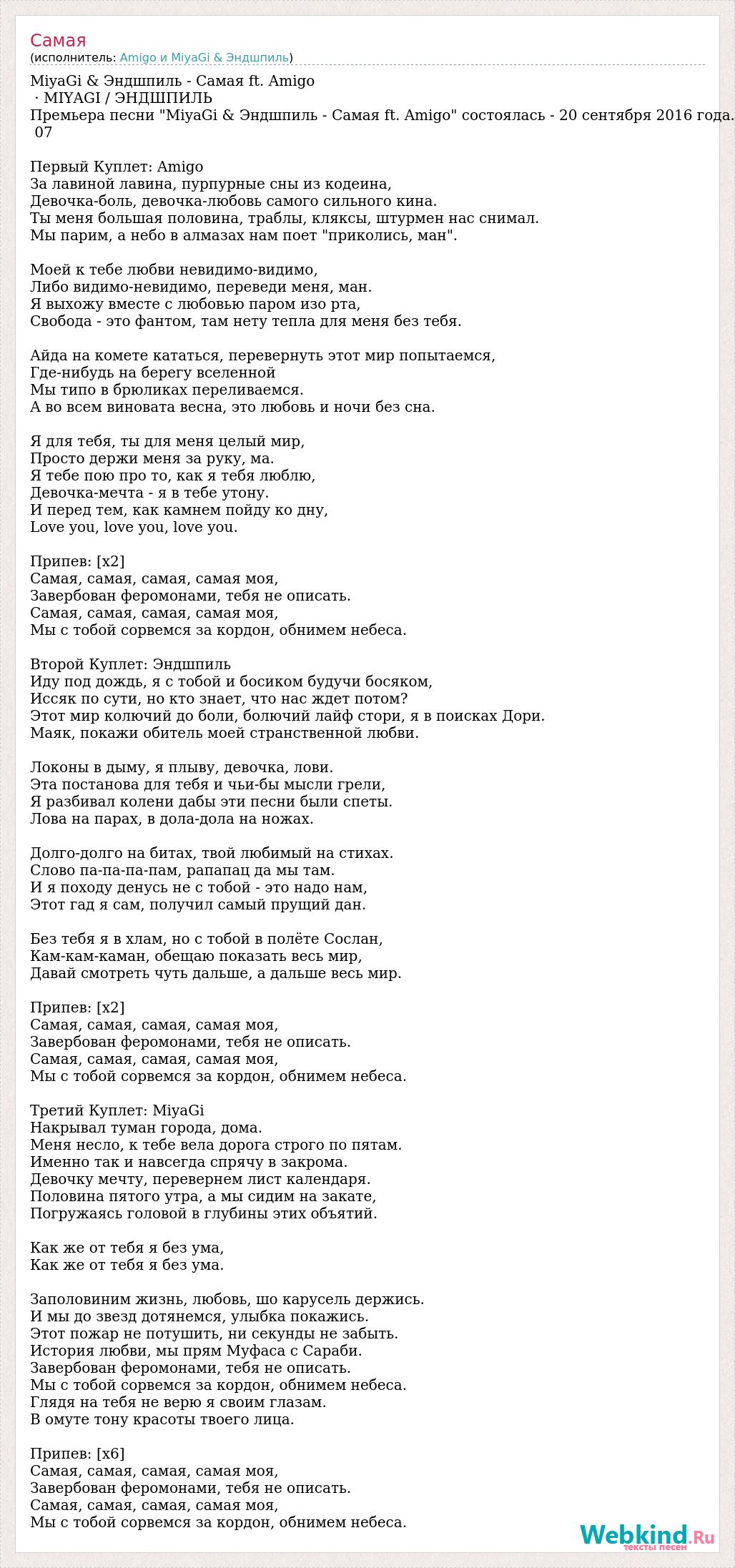MiyaGi & Эндшпиль - Самая ft. Amigo · MIYAGI / ЭНДШПИЛЬ Премьера песни "MiyaGi & Эндшпиль - Cамая ft. Amigo" состоялась - 20 сентября 2016 года. 07 Первый Куплет: Amigo За лавиной лавина, пурпурные сны из кодеина, Девочка-боль, девочка-любовь самого сильного кина. Ты меня большая половина, траблы, кляксы, штурмен нас снимал. Мы парим, а небо в алмазах нам поет "приколись, ман". Моей к тебе любви невидимо-видимо, Либо видимо-невидимо, переведи меня, ман. Я выхожу вместе с любовью паром изо рта, Свобода - это фантом, там нету тепла для меня без тебя. Айда на комете кататься, перевернуть этот мир попытаемся, Где-нибудь на берегу вселенной Мы типо в брюликах переливаемся. А во всем виновата весна, это любовь и ночи без сна. Я для тебя, ты для меня целый мир, Просто держи меня за руку, ма. Я тебе пою про то, как я тебя люблю, Девочка-мечта - я в тебе утону. И перед тем, как камнем пойду ко дну, Love you, love you, love you. Припев: [х2] Самая, самая, самая, самая моя, Завербован феромонами, тебя не описать. Самая, самая, самая, самая моя, Мы с тобой сорвемся за кордон, обнимем небеса. Второй Куплет: Эндшпиль Иду под дождь, я с тобой и босиком будучи босяком, Иссяк по сути, но кто знает, что нас ждет потом? Этот мир колючий до боли, болючий лайф стори, я в поисках Дори. Маяк, покажи обитель моей странственной любви. Локоны в дыму, я плыву, девочка, лови. Эта постанова для тебя и чьи-бы мысли грели, Я разбивал колени дабы эти песни были спеты. Лова на парах, в дола-дола на ножах. Долго-долго на битах, твой любимый на стихах. Слово па-па-па-пам, рапапац да мы там. И я походу денусь не с тобой - это надо нам, Этот гад я сам, получил самый прущий дан. Без тебя я в хлам, но с тобой в полёте Сослан, Кам-кам-каман, обещаю показать весь мир, Давай смотреть чуть дальше, а дальше весь мир. Припев: [х2] Самая, самая, самая, самая моя, Завербован феромонами, тебя не описать. Самая, самая, самая, самая моя, Мы с тобой сорвемся за кордон, обнимем небеса. Третий Куплет: MiyaGi Накрывал туман города, дома. Меня несло, к тебе вела дорога строго по пятам. Именно так и навсегда спрячу в закрома. Девочку мечту, перевернем лист календаря. Половина пятого утра, а мы сидим на закате, Погружаясь головой в глубины этих объятий. Как же от тебя я без ума, Как же от тебя я без ума. Заполовиним жизнь, любовь, шо карусель держись. И мы до звезд дотянемся, улыбка покажись. Этот пожар не потушить, ни секунды не забыть. История любви, мы прям Муфаса с Сараби. Завербован феромонами, тебя не описать. Мы с тобой сорвемся за кордон, обнимем небеса. Глядя на тебя не верю я своим глазам. В омуте тону красоты твоего лица. Припев: [х6] Самая, самая, самая, самая моя, Завербован феромонами, тебя не описать. Самая, самая, самая, самая моя, Мы с тобой сорвемся за кордон, обнимем небеса.