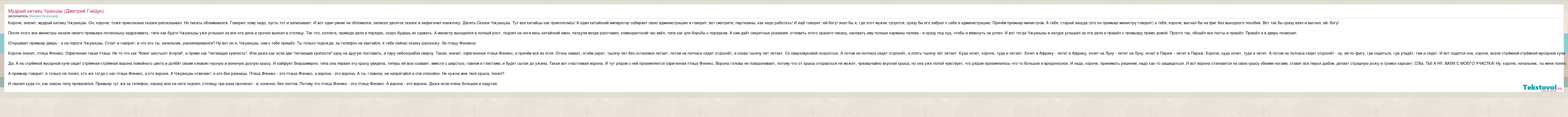 Короче, значит, мудрый китаец Чжуанцзы. Он, короче, тоже прикольные сказки рассказывал. Но писать обламывался. Говорил: кому надо, пусть тот и записывает. И вот один умник не обломался, записал десяток сказок и зафигачил книжечку: Десять Сказок Чжуанцзы. Тут все китайцы как прикололись! А один китайский император собирает свою администрацию и говорит: вот смотрите, партизаны, как надо работать! И ещё говорит: ей-богу! знал бы я, где этот мужик тусуется, сразу бы его забрал к себе в администрацию. Причём премьер-министром. А тебя, старый зануда (это он премьер-министру говорит) а тебя, короче, выгнал бы на фиг без выходного пособия. Вот так бы сразу взял и выгнал, ей- богу! После этого все министры начали своего премьера потихоньку задрачивать: типа как будто Чжуанцзы уже услышал за все эти дела и срочно выехал в столицу. Так что, коллега, приводи дела в порядок, скоро будешь их сдавать. А министр высадился в полный рост, поднял на ноги весь китайский омон, патрули везде расставил, комендантский час ввёл, типа как для борьбы с порядком. А сам даёт секретные указания: отловить этого сраного писаку, насовать ему полные карманы палева - и сразу под суд, чтобы и мявкнуть не успел. И вот тогда Чжуанцзы в натуре услышал за эти дела и пришёл к премьеру прямо домой. Просто так, обошёл все посты и пришёл. Пришёл и в дверь позвонил. Открывает премьер дверь - а на пороге Чжуанцзы. Стоит и говорит: и что это ты, начальник, раскипишевался? Ну вот он я, Чжуанцзы, сам к тебе пришёл. Ты только подожди, за телефон не хватайся, я тебе сейчас сказку расскажу. За птицу Феникса. Короче значит, птица Феникс. Офигенная такая птица. Не то что как "боинг шестьсот второй", а прямо как "летающая крепость". Или даже как если две "летающие крепости" одну на другую поставить, и пару небоскребов сверху. Такая, значит, офигеннная птица Феникс, и причём вся из огня. Огонь хавает, огнём серет, тысячу лет без остановки летает, потом на полчаса сядет отдохнёт, и снова тысячу лет летает. Со сверхзвуковой скоростью. А потом на полчаса сядет отдохнёт, и опять тысячу лет летает. Куда хочет, короче, туда и летает. Хочет в Африку - летит в Африку, хочет на Луну - летит на Луну, хочет в Париж - летит в Париж. Короче, куда хочет, туда и летит. А потом на полчаса сядет отдохнёт - ну, ей по фигу, где садиться, где упадёт, там и сядет. И вот садится она, короче, возле стрёмной-стрёмной мусорной кучи. Да. А на стрёмной мусорной куче сидит стрёмная-стрёмная ворона помойного цвета и долбёт своим клювом гнусную и вонючую дохлую крысу. И кайфует безразмерно: типа она первая эту крысу увидела, теперь её всю схавает, вместе с шерстью, гавном и глистами, и будет сытая до ужина. Такая вот счастливая ворона. И тут рядом с ней приземляется офигенная птица Феникс. Ворона головы не поворачивает, потому что от крысы оторваться не может, чрезвычайно вкусная крыса, но она уже попой чувствует, что рядом приземлилось что-то большое и вредоносное. И надо, короче, принимать решение, надо как-то защищаться. И вот ворона становится на свою крысу обеими ногами, ставит все перья дыбом, делает страшную рожу и громко каркает: СЛЫ, ТЫ! А НУ, ВАЛИ С МОЕГО УЧАСТКА! Ну, короче, начальник, ты меня понял. А премьер говорит: я только не понял, кто же тогда с нас птица Феникс, а кто ворона. А Чжуанцзы отвечает: а это без разницы. Птица Феникс - это птица Феникс, а ворона - 