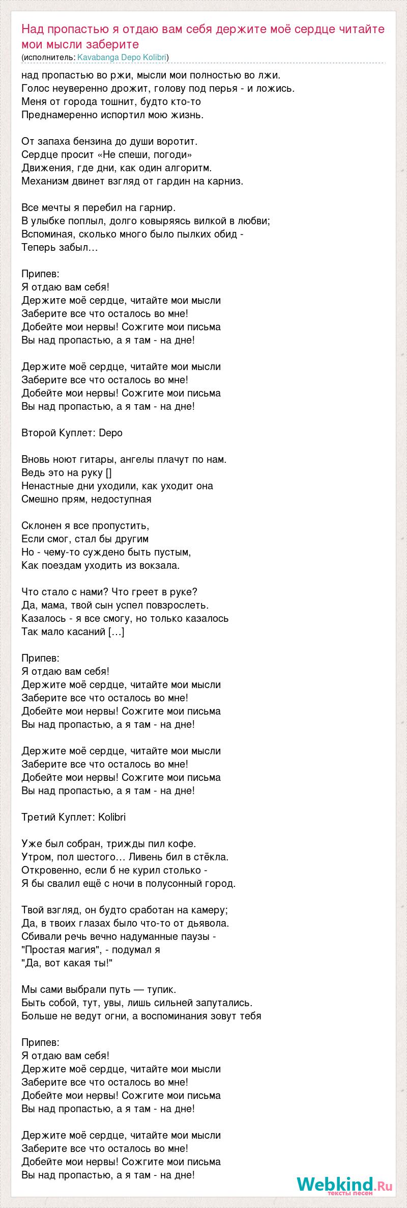 над пропастью во ржи, мысли мои полностью во лжи. Голос неуверенно дрожит, голову под перья - и ложись. Меня от города тошнит, будто кто-то Преднамеренно испортил мою жизнь. От запаха бензина до души воротит. Сердце просит «Не спеши, погоди» Движения, где дни, как один алгоритм. Механизм двинет взгляд от гардин на карниз. Все мечты я перебил на гарнир. В улыбке поплыл, долго ковыряясь вилкой в любви; Вспоминая, сколько много было пылких обид - Теперь забыл… Припев: Я отдаю вам себя! Держите моё сердце, читайте мои мысли Заберите все что осталось во мне! Добейте мои нервы! Сожгите мои письма Вы над пропастью, а я там - на дне! Держите моё сердце, читайте мои мысли Заберите все что осталось во мне! Добейте мои нервы! Сожгите мои письма Вы над пропастью, а я там - на дне! Второй Куплет: Depo Вновь ноют гитары, ангелы плачут по нам. Ведь это на руку [] Ненастные дни уходили, как уходит она Cмешно прям, недоступная Склонен я все пропустить, Если смог, стал бы другим Но - чему-то суждено быть пустым, Как поездам уходить из вокзала. Что стало с нами? Что греет в руке? Да, мама, твой сын успел повзрослеть. Казалось - я все смогу, но только казалось Так мало касаний […] Припев: Я отдаю вам себя! Держите моё сердце, читайте мои мысли Заберите все что осталось во мне! Добейте мои нервы! Сожгите мои письма Вы над пропастью, а я там - на дне! Держите моё сердце, читайте мои мысли Заберите все что осталось во мне! Добейте мои нервы! Сожгите мои письма Вы над пропастью, а я там - на дне! Третий Куплет: Kolibri Уже был собран, трижды пил кофе. Утром, пол шестого… Ливень бил в стёкла. Откровенно, если б не курил столько - Я бы свалил ещё с ночи в полусонный город. Твой взгляд, он будто сработан на камеру; Да, в твоих глазах было что-то от дьявола. Сбивали речь вечно надуманные паузы - "Простая магия", - подумал я "Да, вот какая ты!" Мы сами выбрали путь — тупик. Быть собой, тут, увы, лишь сильней запутались. Больше не ведут огни, а воспоминания зовут тебя Припев: Я отдаю вам себя! Держите моё сердце, читайте мои мысли Заберите все что осталось во мне! Добейте мои нервы! Сожгите мои письма Вы над пропастью, а я там - на дне! Держите моё сердце, читайте мои мысли Заберите все что осталось во мне! Добейте мои нервы! Сожгите мои письма Вы над пропастью, а я там - на дне!