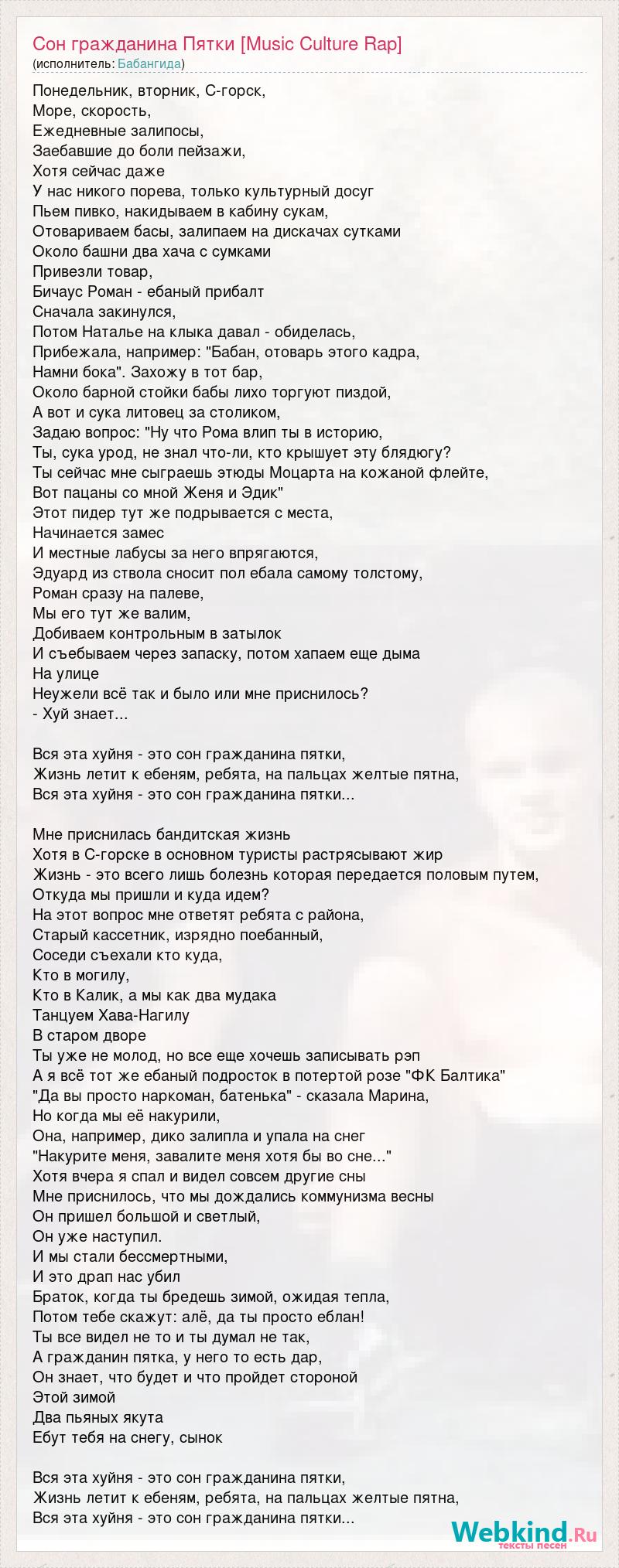 Понедельник, вторник, С-горск, Море, скорость, Ежедневные залипосы, Заебавшие до боли пейзажи, Хотя сейчас даже У нас никого порева, только культурный досуг Пьем пивко, накидываем в кабину сукам, Отовариваем басы, залипаем на дискачах сутками Около башни два хача с сумками Привезли товар, Бичаус Роман - ебаный прибалт Сначала закинулся, Потом Наталье на клыка давал - обиделась, Прибежала, например: "Бабан, отоварь этого кадра, Намни бока". Захожу в тот бар, Около барной стойки бабы лихо торгуют пиздой, А вот и сука литовец за столиком, Задаю вопрос: "Ну что Рома влип ты в историю, Ты, сука урод, не знал что-ли, кто крышует эту блядюгу? Ты сейчас мне сыграешь этюды Моцарта на кожаной флейте, Вот пацаны со мной Женя и Эдик" Этот пидер тут же подрывается с места, Начинается замес И местные лабусы за него впрягаются, Эдуард из ствола сносит пол ебала самому толстому, Роман сразу на палеве, Мы его тут же валим, Добиваем контрольным в затылок И съебываем через запаску, потом хапаем еще дыма На улице Неужели всё так и было или мне приснилось? - Хуй знает... Вся эта хуйня - это сон гражданина пятки, Жизнь летит к ебеням, ребята, на пальцах желтые пятна, Вся эта хуйня - это сон гражданина пятки... Мне приснилась бандитская жизнь Хотя в С-горске в основном туристы растрясывают жир Жизнь - это всего лишь болезнь которая передается половым путем, Откуда мы пришли и куда идем? На этот вопрос мне ответят ребята с района, Старый кассетник, изрядно поебанный, Соседи съехали кто куда, Кто в могилу, Кто в Калик, а мы как два мудака Танцуем Хава-Нагилу В старом дворе Ты уже не молод, но все еще хочешь записывать рэп А я всё тот же ебаный подросток в потертой розе "ФК Балтика" "Да вы просто наркоман, батенька" - сказала Марина, Но когда мы её накурили, Она, например, дико залипла и упала на снег "Накурите меня, завалите меня хотя бы во сне..." Хотя вчера я спал и видел совсем другие сны Мне приснилось, что мы дождались коммунизма весны Он пришел большой и светлый, Он уже наступил. И мы стали бессмертными, И это драп нас убил Браток, когда ты бредешь зимой, ожидая тепла, Потом тебе скажут: алё, да ты просто еблан! Ты все видел не то и ты думал не так, А гражданин пятка, у него то есть дар, Он знает, что будет и что пройдет стороной Этой зимой Два пьяных якута Ебут тебя на снегу, сынок Вся эта хуйня - это сон гражданина пятки, Жизнь летит к ебеням, ребята, на пальцах желтые пятна, Вся эта хуйня - это сон гражданина пятки...